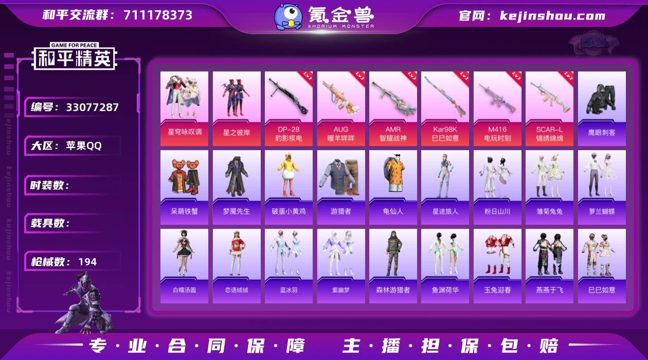 WJ838【地铁满天赋2粉装-8特效枪 深海小丑鱼】苹果手Q-2粉装-8特效枪-140套装-194枪皮-6王牌印记-荣耀皇冠Ⅲ-52947热力值 【2粉装】星穹咏叹调,星之彼岸 【8特效枪】Mk14-福马献瑞[2级],Kar98K-巳巳如意[5级],UMP45-萌骑冒险[5级],SCAR-L-锦绣绵绵[5级],AUG-暖羊咩咩[5级],DP-28-豹影疾电[5级],AMR-智耀战神[6级],M416-电玩时刻[5级] 【2稀有】深海小丑鱼,AKM-缤纷海域 【2飞行器】粉色滑翔尾迹,繁龙极客飞行器 【2背包】深海小丑鱼背包,金羽特工背包 【322其它衣服和枪皮】飞驰魅影,SS30特训,SS31特训,夏日倾情,鹤鸣,街头潮人,SS20特训,特殊使命,红釉青花,SS23特训,鹰眼刺客,萌趣咩咩,雨过天青,SS27特训,龙魂突击队,福马献瑞,柠萌假日,战术大师,冰河战士,SS29特训,破蛋小黄鸡,极速竞梦,阳光火鸡,炽纹蛇影,SS28特训,麻辣教官,缤纷焰火,紫幽梦,SS21特训,燕燕于飞,玉兔迎春,橘黑制服,探宝勇士,白糯汤圆,SS17特训,午间小调,蝶变,酒红色名流,阳光菠萝,快乐星愿,超能勇士,甜蜜熊情侣,白色伏地魔,龟仙人,湖蓝色名流,SS19特训,角色-海琴烟,黑色伏地魔,马上有钱,纯真浪花,大橘大利,明鸳圣池,狙击之神,竞技名士,风迹短诗,老实芭蕉,福星高照,热情海星,灼焰舞者,萝兰蝴蝶,红色运动,萌鸡速...