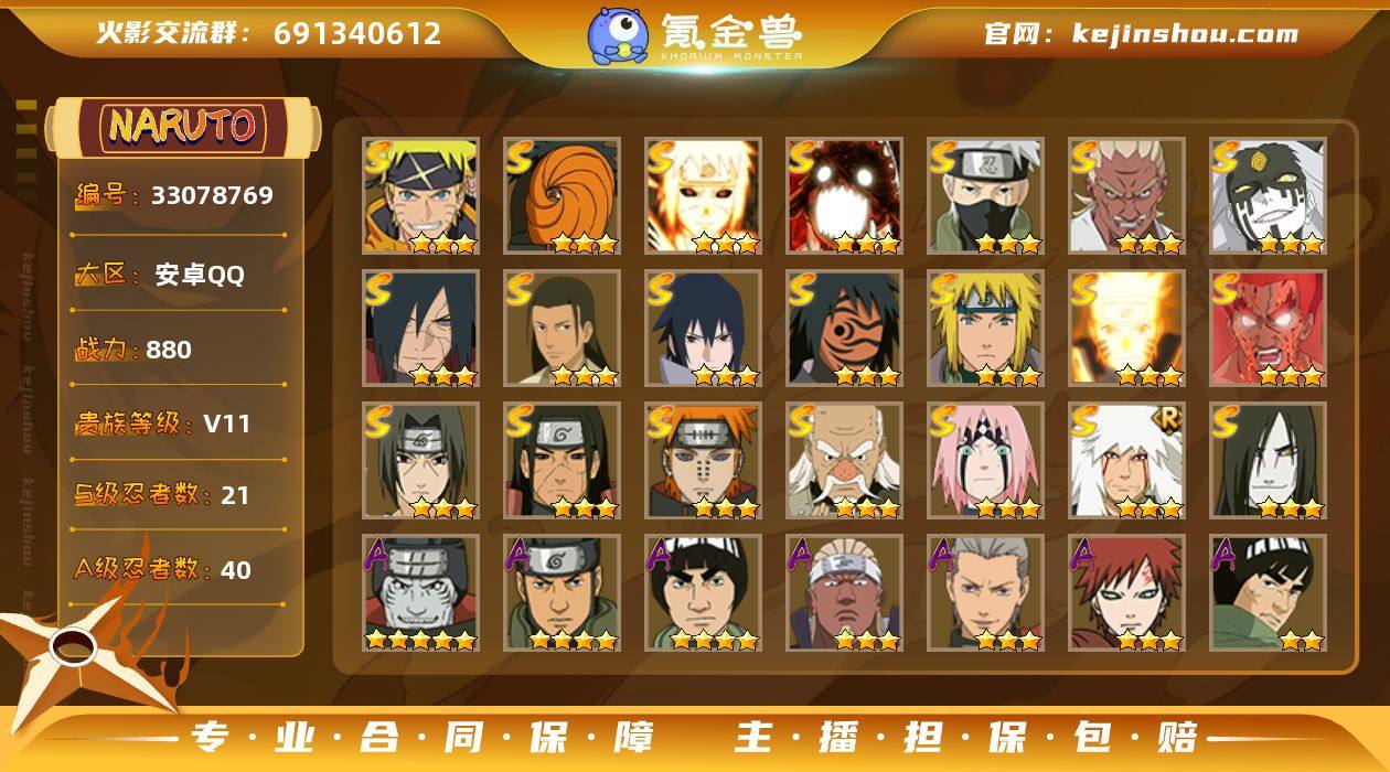【性价比中配号 活动价】y7471 战力880w 21s 40a 熊猫 侠隐蛞蝓 7个198a 3100金币 25忍法帖已开1级 侠隐纲手时装 95片传说自来也 65片秽土鼬 50片须佐止水 87片四代风 71片舍人