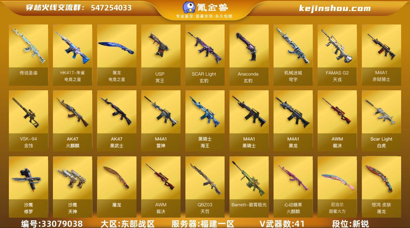 MCF850【41V 传说圣谕 传说星骇 白虎 2黑骑士 3音效卡 裁决 天罚 碧霄极光】【传说武器】:传说圣谕 【传说角色】:传说星骇 【热门武器】:传说圣谕,Scar Light-白虎,M4A1-黑骑士*2,加特林-炼狱,沙鹰-修罗*2 【音效卡】:AWM-裁决音效卡,QBZ03-天罚音效卡,Barrett-碧霄极光音效卡 【皮肤】:Scar Light-白虎-暗星,裁决-运输船 皮肤,火麒麟-心动糖果,屠龙-惊鸿 皮肤 【角色】:魅影,荆棘,战地猎狐,乔伊教练,修道士,初恋灵狐,嘉年华灵狐,娟娟,兰妹妹,零-水下丽影,灵狐者-X,龙儿-小淘气,麻雀,萌儿,蛇姬,斯沃特-X,蜀雪,铁骑荣耀,兔囡囡,雪莉杨,智影 【人偶武器】:异变清道夫-蛇影双骄,AWM-灵狐-15周年嘉年华,迷你超能女侍,迷你深渊冰龙*21,迷你裂空之翼,迷你波特博士*2,夺魂*4,迷你牛牛,迷你火种,生化手雷-机甲核心*2 【暴走生化】:超级对讲机 【挑战大师】:冰龙粉碎者-白马银枪,激光毁灭者III-白马银枪,机甲撕裂者III,试炼破坏者III,KAC-圣炎切割者III,神圣爆裂者-末日III,阐释者III 【英雄级武器】:AK47-火麒麟,M4A1-黑龙,M4A1-雷神*2,M4A1-黑骑士*2,AK47-黑武士,Scar Light-白虎,QBZ03-天罚*2,无影-神兵利器,FAMAS...