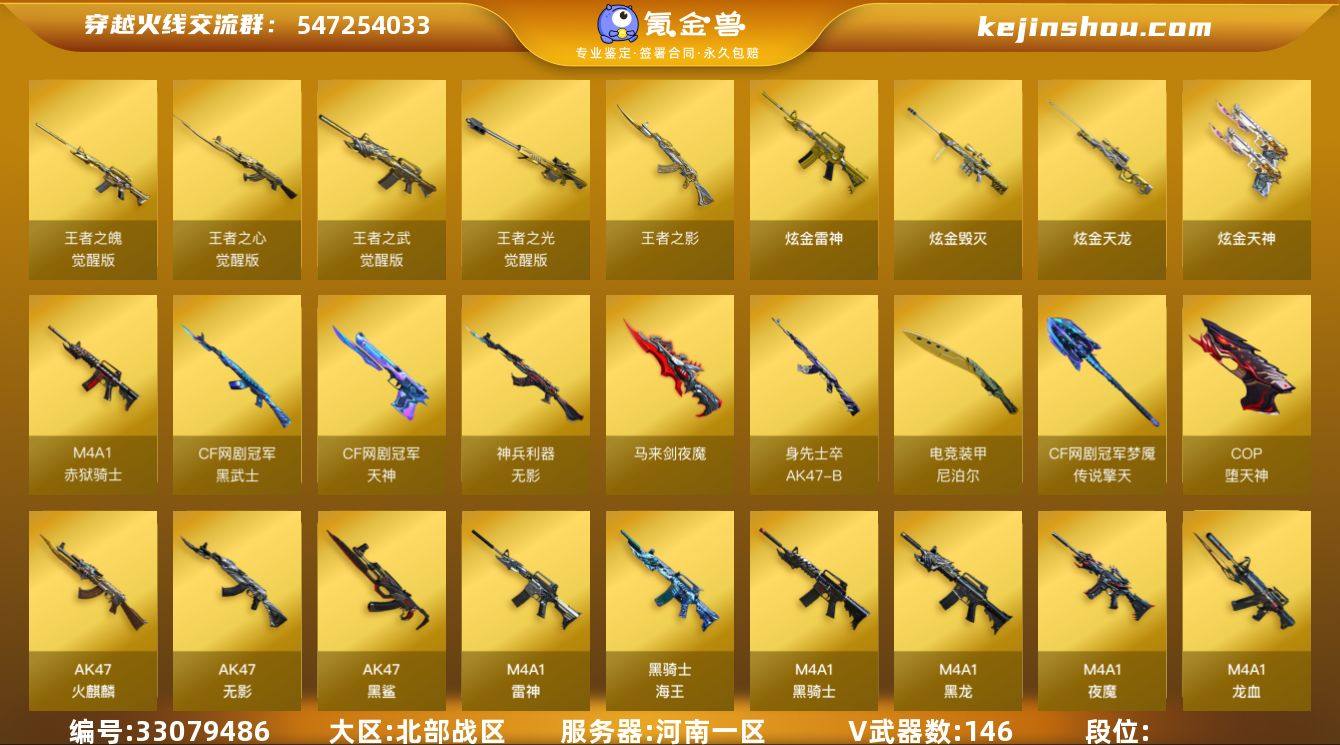 北部战区(河南一区)ys【精品爆破生化号】传说【传说光耀】146v【M200-幻神,夜魔套装,电竞装甲套装,动感闪耀套装,CF网剧冠军套装,ScarLight-白虎,QBZ03-金色蔷薇,HK417-朱雀,AWM-裁决,6烈龙+5炼狱+6修罗+死亡之眼+四防凌霄(全生化带生化背包变更)+沙漠玫瑰(带生化背包变更),COP-堕天神*2,破空枪刃-夜魔*3,柯尔特-电竞装甲,Colt1911-大黄蜂,QBZ03-吕布,猫猫手套】8王者【王者之心,王者之影,王者之魄,王者之武,王者之光】9炫金【炫金雷神,炫金骑士,炫金毁灭,炫金天龙,炫金天神】8角色【四防凌霄(全生化带生化背包变更),四防王者零-国色天香,沙漠玫瑰(带生化背包变更),迷迭香,樱,魅影,乔伊教练,王者玲珑,职业选手】4音效【M4A1-雷神音效卡,M4A1-黑骑士音效卡,AK47-火麒麟音效卡,Barrett-毁灭音效卡】45皮【雷神-烈虎,黑骑士-白马银枪,雷神-机甲刑天,毁灭-耀金,黑骑士-耀金,毁灭-星空,黑骑士-地狱火,雷神-宠儿,毁灭-战神张飞,无影-耀金,火麒麟-雷神,修罗-星空,毁灭-墨兰,火麒麟-心动糖果,火麒麟-平天大圣,火麒麟-CF STAR,天龙-CF STAR,千变-孔明,雷神-虎将,火麒麟-华夏之心,无影-霓棠,毁灭-黑大圣】挑战枪【暴君...
