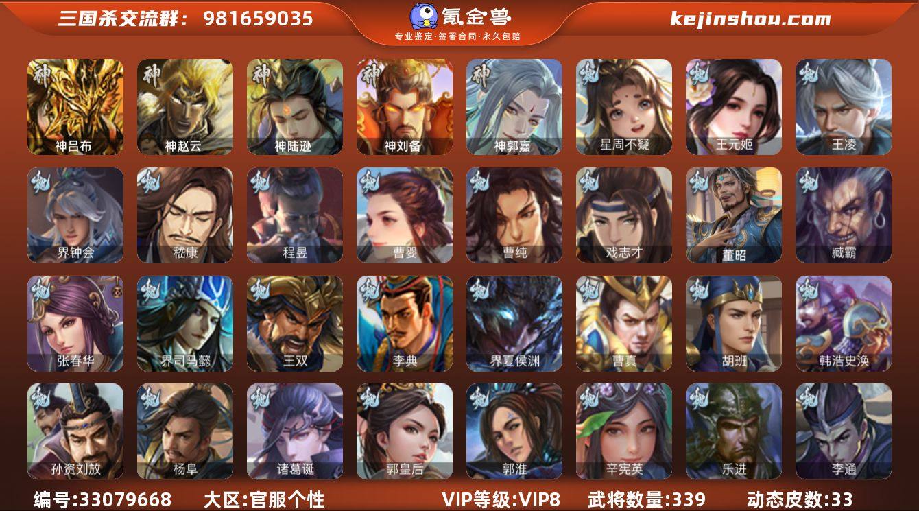 官阶:大将军;VIP等级:VIP8;史诗武将数量:35;动态皮肤数量:33;武将总数:339;史诗宝珠数量:40;将魂数量:2827;神将:5;魏国史诗武将:23;蜀国史诗武将:8;吴国史诗武将:2;群史诗武将:11