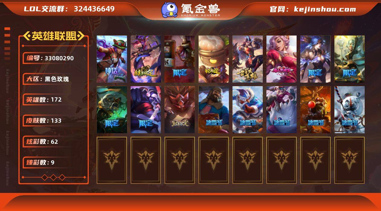未定级段位-172英雄-133皮肤-62炫彩-0终极-2神话-19限定-11传说-23史诗 【神话皮肤】:十五周年纪念希维尔 【至臻皮肤】:至臻永恒星灵佐伊 【臻彩皮肤】:无畏骑士瑟庄妮赤子初心,征服者韦鲁斯炫金,冠军之矛卡莉丝塔凯旋圣装,灵魂莲华锐雯流火,星之守护者霞烈羽,可爱可爱粉红红布里茨,魔女阿卡丽虚荣,战斗公主安妮纹章之刻印强运,霸天异形卡兹克丛林灾厄 【年限皮肤】:玉净夜叉凯特琳,点心宝贝阿木木 【情人节限定】:穿心之剑菲奥娜,觅心之翼奎因,幽梦玫瑰辛德拉 【冰雪限定】:持胡萝卜的雪人易,雪默丁格,圣诞驯鹿克格莫,魄罗骑士瑟庄妮,冰雪节格雷福斯 【限定皮肤】:Fnatic迦娜,Fnatic卡尔萨斯,暗杀星慎,FPX墨菲特,暗裔英雄盖伦,胜利女神娑娜,南瓜头费德提克,玉剑传说舞龙卫,防暴士兵辛吉德 【传说皮肤】:约德尔国队长提莫,最终BOSS维迦,源计划净化薇恩,银河魔装机神兰博,战斗学院伊泽瑞尔,金牌主播德莱文,霸天异形卡兹克,神王德莱厄斯,蔷薇绅士杰斯,神龙尊者夜月幻龙亚索,西部魔影卢锡安 【史诗皮肤】:屠龙勇士赵信,天人合一易,地狱火阿利斯塔,月光女神阿忒弥斯索拉卡,狼外婆沃里克,百夫长贾克斯,少林武僧贾克斯,绝代智将斯...
