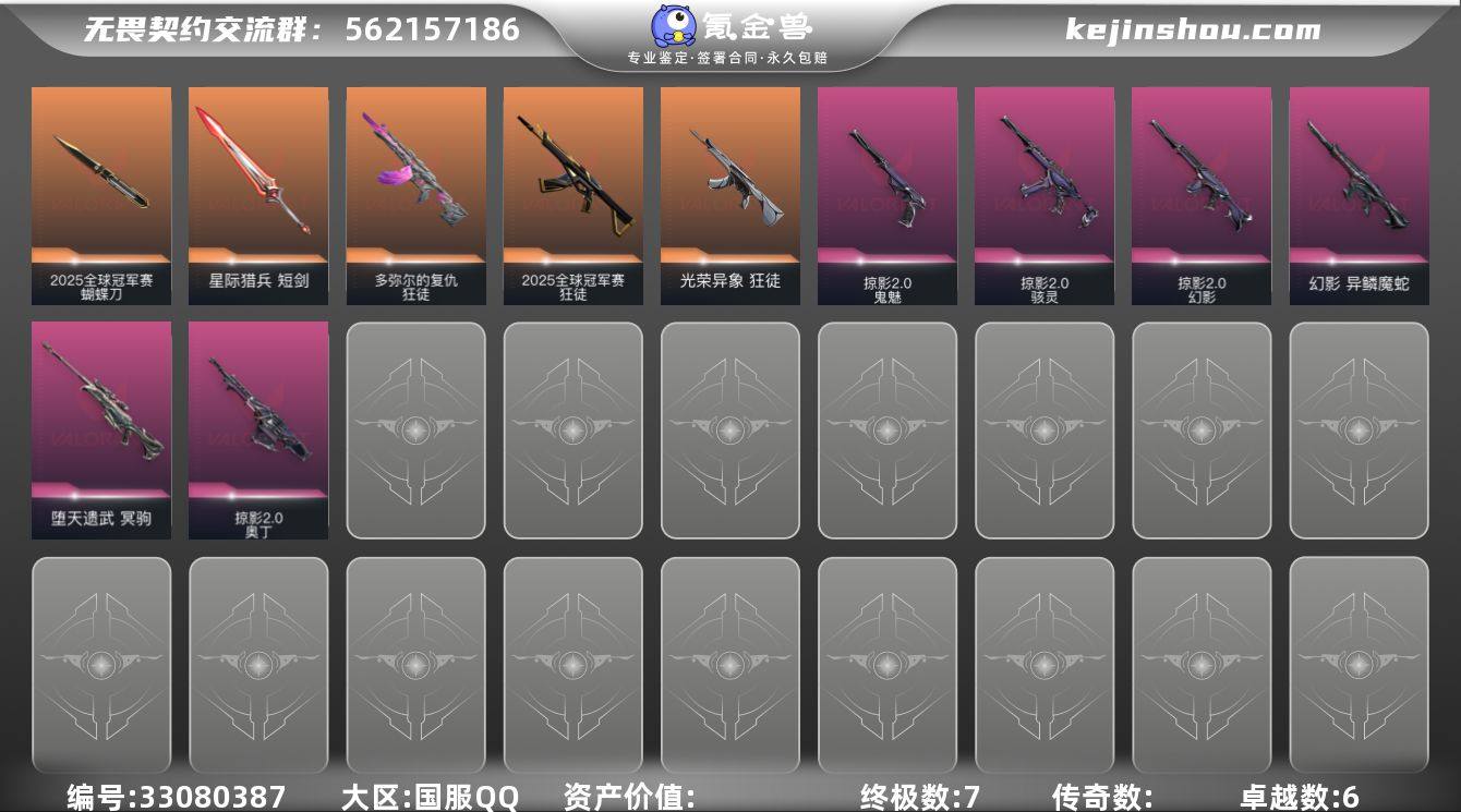 【套装】:2025全球冠军赛套装,掠影//2.0套装 【英雄】:幻棱,炼狱,维斯,暮蝶,钛狐,壹决,铁臂,捷风,幽影,不死鸟,贤者,猎枭,蝰蛇,零,芮娜,奇乐,尚勃勒,霓虹,斯凯,K/O,海神,盖可,黑梦,钢锁 【近战武器】:近战武器-2025全球冠军赛 蝴蝶刀,近战武器-影钩,近战武器-星际猎兵 短剑 【狂徒】:狂徒-2025全球冠军赛,狂徒-光荣异象,狂徒-多弥尔的复仇 【幻影】:幻影-异鳞魔蛇,幻影-掠影//2.0 【冥驹】:冥驹-堕天遗武 【奥丁】:奥丁-掠影//2.0 【骇灵】:骇灵-掠影//2.0 【鬼魅】:鬼魅-掠影//2.0 【卡面】:无畏契约GO!第一卷:芮娜 卡面,无畏契约GO!第一卷:零 卡面,代号红色 卡面,新兵报到 卡面,V契约 卡面,无畏契约 卡面 【喷漆】:买装还是存钱 喷漆,胜利属于无畏契约 喷漆,GLHF 喷漆,无畏契约 喷漆 【挂饰】:天外飞客 挂饰,无畏契约 纪念币 挂饰