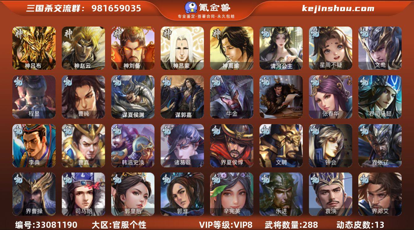 【4514】官阶:骠骑将军;VIP等级:VIP8;史诗武将数量:23;动态皮肤数量:13;武将总数:288;史诗宝珠数量:1;将魂数量:3908;神将:3;魏国史诗武将:10;蜀国史诗武将:4;吴国史诗武将:5;群史诗武将:9
