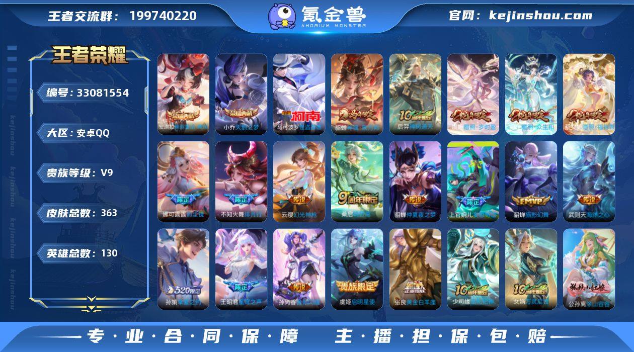 【王者荣耀】珍品无双0 典藏3 无双0 珍品传说1 传说22 史诗110 英雄130 皮肤363 贵族9级 荣耀典藏:天鹅之梦|武则天|颠倒童话·魔镜__珍品传说:怪盗基德__传说皮肤:鸣野蒿|前尘镜|音你闪耀|挚爱之约|启明星使|海洋之心|仲夏夜之梦|黄金白羊座|猫影幻舞|瑶-时之祈愿|绯月行|孙尚香-末日机甲|安琪拉-追逃游戏|妄想奇谈|星穹之声|朵莉亚-心动手记|幻光神枪|愿照·岁时盈|愿照·众生和|愿照·福禄聚|神树通天|神骥·聚万邦__稀有限定:寅虎·展翼|寅虎·心曲|一生所爱|纯白花嫁|蔷薇恋人|女儿国国王|山海·碧波行|时之彼端|狮舞东方|拒霜思|百解令|妲己-时之奇旅|大漠名商|地狱燃心|电玩高手|高山流水|古海寻踪|海滩派对|海盐诗旅|航海奇遇记|胡桃异想国|幻夜卜梦|皇家上将|火炮绅士|剑破天穹|江河有灵|降魔|金庭之子|梦圆繁星|迷踪丽影|魔术师|匿光决锋者|女武神|奇幻香踪|千军破阵|擒涛扼浪|青焰无极|驱傩正仪|热情桑巴|荣光圣徽|沙漠行僧|探海日志|天狼绘梦者|天穹祈灯|阿古朵-顽趣|万华元夜|妄想食味|无心|五谷丰年|午后时光|星界游侠|星空之诺|演武夺筹|夜都怪侠|阴阳师|吟游魔法|游园惊梦|驭风魔法|真爱魔法|暗隐猎兽者|白蛇|缤纷独角兽|冰冠公主|冰雪圆舞曲|乘风破浪|大乔-猫狗日记|...