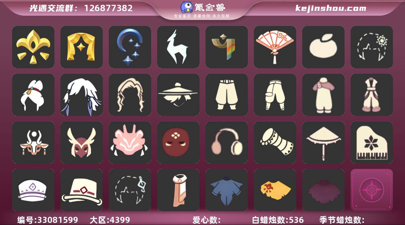 安卓官服 邮箱账号 1珍稀物品 5毕业季 6毕业图 536蜡烛 【珍稀物品】白枭(帝企鹅发) 【季节已毕业】集结季,表演季,夜行季,九色鹿(九色鹿季),彩染季 【完成地图】晨岛,云野,雨林,霞谷,墓土(暮土),禁阁 【礼包】橘子(大橘大利),雪花(雪花发夹),青衫落拓礼包,献瑞折扇礼包 【裤子】飞天裤(柔缎花边连)(九色鹿丝带裤),武士裤,背带裤,搓澡巾 【面具】黄眉企鹅面具,夜行毕业面具(棕熊面具),辉光羚羊面具,贴花面具(丛林黑面具) 【面饰】红耳机 【发型】飞天盘发(九色鹿丸子头),虚荣,归巢毕业发型(五塑彩羽发),若笠(箬笠) 【头饰】平顶帽,蓝色音乐会(蓝色音乐符),行军锅头盔(六边锅帽子)(双耳锅帽子) 【斗篷】燕尾斗篷,黄色连帽披风(连帽斗篷)(斜边队长斗篷),粉红绒毛斗篷(绒毛斗篷),彩染围巾斗篷,绿芽,海洋斗 【配饰】圆鼓(手拍大鼓),雨伞,高音钢琴(白色高脚钢琴)