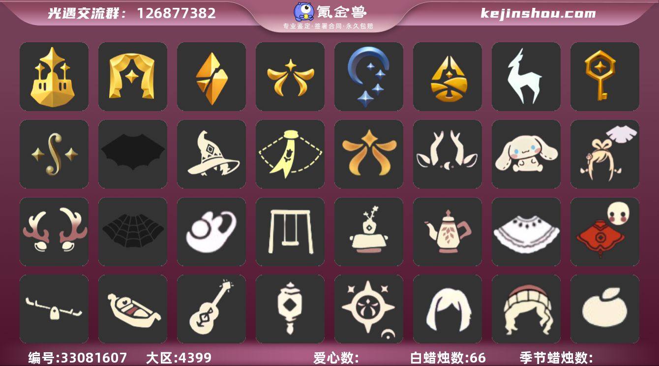 安卓官服 手机账号 3珍稀物品 9毕业季 6毕业图 66蜡烛 【珍稀物品】白枭(帝企鹅发),透明蝶翼斗,彩虹围巾(五塑彩带斗) 【季节已毕业】梦想季,表演季,破晓季,欧若拉季(欧若拉),夜行季,归巢季,九色鹿(九色鹿季),筑巢季,二重奏季 【完成地图】晨岛,云野,雨林,霞谷,墓土(暮土),禁阁 【礼包】兔子鞋(兔子拖鞋),新年裤(瑞气服饰),水母(水母肩饰),奔跑发型(奔离远行发),海蓝波浪发型(海洋发型),彩虹帽(多彩绒帽),巫师(巫师帽),绊爱(绊爱斗篷)(绊爱礼包),橘子(大橘大利),贝壳(贝壳发饰),兔子(玉兔头饰)(玉兔发饰)(兔子发饰),星月头饰(星月头冠),九色鹿角(神鹿祝福头饰)(神鹿祝福礼包),新年耳钉(金鳞耳饰),彩虹耳钉(彩虹耳饰),彩虹耳机,枯角(巫树犄角),鹿角(圣诞鹿角),创始人(创始人斗篷),围巾(小王子斗篷)(小王子围巾),欧若拉之翼,福娃(福娃礼包)(春之日礼包)(铜钱斗),线框斗篷礼包(周年线框斗篷),蝙蝠套(蝙蝠斗篷)(南瓜头),蜘蛛斗(蛛丝斗篷)(蛛网斗篷),白绒金(白雪斗篷),竖琴(雏鸟之琴),吉他(音韵吉他)(白吉他),手碟(凯旋手碟),人声乐器(欧若拉之声),小提琴(凯旋提琴),灯笼(中秋灯笼),秋千(情人秋千),跷跷板(情人跷跷板),茶桌(花憩茶桌),茶壶(小憩茶桌),小船(情人小船),南瓜(冥龙南瓜...