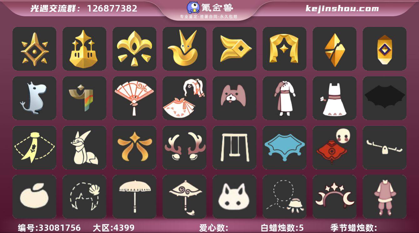 安卓官服 手机账号 3珍稀物品 10毕业季 6毕业图 5蜡烛 【珍稀物品】白枭(帝企鹅发),阿努比斯(狗头),玫瑰花 【季节已毕业】预言季,梦想季,集结季,小王子季(王子季),风行季,表演季,破晓季,追忆季,姆明季,彩染季 【完成地图】晨岛,云野,雨林,霞谷,墓土(暮土),禁阁 【礼包】新年裤(瑞气服饰),龙鳞束身长袍,向日葵连衣裙(连衣裙),周年影院套餐礼包,水母(水母肩饰),姆明饰品套装(姆明尾巴),橘子(大橘大利),小狗周年发饰(小狗周年头饰),贝壳(贝壳发饰),兔子(玉兔头饰)(玉兔发饰)(兔子发饰),四叶草(四叶草头饰),星月头饰(星月头冠),新年耳钉(金鳞耳饰),日光耳环,鹿角(圣诞鹿角),创始人(创始人斗篷),围巾(小王子斗篷)(小王子围巾),欧若拉之翼,福娃(福娃礼包)(春之日礼包)(铜钱斗),衔福献瑞礼包(衔福献瑞斗篷),蝙蝠套(蝙蝠斗篷)(南瓜头),瑞雪(瑞雪斗篷)(暖冬瑞雪),红伞(瑞气纸伞),献瑞折扇礼包,黄伞(夏日阳伞),秋千(情人秋千),跷跷板(情人跷跷板),小狐狸(狐狸背包) 【裤子】青鸟尊贵蓬头裤子(蓝色燕尾服),妮妮裙子(妮妮长裙),王子服(小王子套装),武士裤,背带裤,击剑裤 【面具】黄眉企鹅面具,辉光羚羊面具,贴花面具(丛林黑面具),阿努比斯,凤凰面具 【面饰】青鸟毕业面饰(青鸟面饰) 【项...