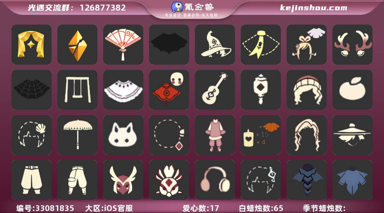 账号类型: 邮箱账号 季节已毕业: 表演季,破晓季 完成地图: 雨林,霞谷 珍稀物品: 白枭 礼包: 蝙蝠套,巫师,围巾,绊爱,鹿角,蜘蛛斗,秋千,白绒金,福娃,吉他,灯笼,彩虹帽,橘子,贝壳,黄伞,兔子,彩虹耳钉,新年裤,创始人,献瑞折扇礼包 裤子: 武士裤,搓澡巾 面具: 凤凰面具,黄眉企鹅面具 面饰: 红耳机 发型: 若笠,虚荣 头饰: 蓝色音乐会 斗篷: 遥鲲斗篷,燕尾斗篷,冥龙斗篷 亮点: 【优质装备】:表演季,白枭(帝企鹅发),武士裤,破晓季,凤凰面具,黄眉企鹅面具,遥鲲斗篷(双翼遥鲲斗),燕尾斗篷,冥龙斗篷,蝙蝠套(蝙蝠斗篷)(南瓜头),福娃(福娃礼包)(春之日礼包)(铜钱斗),绊爱(绊爱斗篷)(绊爱礼包),秋千(情人秋千),黄伞(夏日阳伞),红耳机,围巾(小王子斗篷)(小王子围巾),鹿角(圣诞鹿角),蜘蛛斗(蛛丝斗篷)(蛛网斗篷),吉他(音韵吉他)(白吉他),灯笼(中秋灯笼),巫师(巫师帽),白绒金(白雪斗篷),彩虹帽(多彩绒帽),新年裤(瑞气服饰),雨林,霞谷,若笠(箬笠),创始人(创始人斗篷),献瑞折扇礼包,兔子(玉兔头饰)(玉兔发饰)(兔子发饰),彩虹耳钉(彩虹耳饰),橘子(大橘大利),贝壳(贝壳发饰)