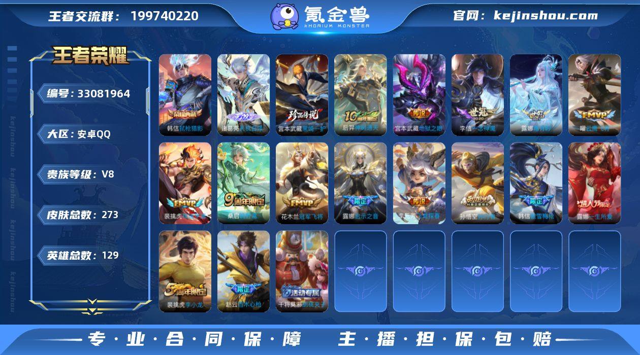 不可二次 安卓Q 1典藏1无双1珍品19传说129英雄273皮肤 弑枪猎影 天机白泽 黑崎一护 群星魔术团云中君 乘龙问璇玑 乘龙铭钟鼎 铠琥珀纪元 神树通天 祥瑞亨通 鸣野蒿 启明星使 寅虎赤拳 启示之音 霜月吟 音你心动男 云鹰飞将 冠军飞将 一念神魔 超时空战士男 飞鸢探春 地狱之眼 末日机甲女 万灵启世 巫礼祀神 幻珠鲛人 逐霄之志 一生所爱 傲雪梅枪 百木心枪 拒霜思 匿光侦查者 孙行者 冰冠公主 原初追逐者 黎明之约 织梦人 黄忠百相守梦 灵蛊蚀心 布丁狗之誓 藏狐褐绒 雪豹霜爪 绮世丹青 星界特工 群星魔术团上官婉儿 燃音魔法 伽罗琥珀纪元 百解令 天秀启明 遇见神鹿 时之奇旅安琪 无限星赏官 李小龙 水晶猎龙者 暗隐猎兽者 猫狗日记男 地狱岩魂 热力回旋 特工魅影 曙光守护者 特工战影 王者荣耀账号