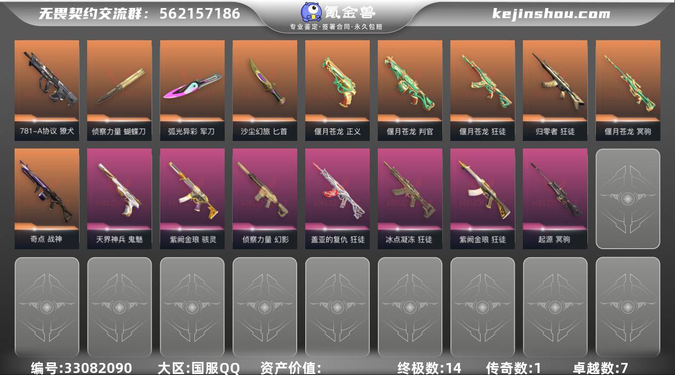 【套装】:偃月苍龙套装,晶态集成套装 【英雄】:幻棱,炼狱,维斯,暮蝶,钛狐,壹决,铁臂,捷风,雷兹,幽影,不死鸟,贤者,猎枭,蝰蛇,零,芮娜,奇乐,尚勃勒,霓虹,斯凯,夜露,星礈,K/O,海神,盖可,黑梦,钢锁 【近战武器】:近战武器-侦察力量 蝴蝶刀,近战武器-剥皮小刀,近战武器-盖亚之愠,近战武器-硅晶刻刀,近战武器-弧光异彩 军刀,近战武器-沙尘幻旅 匕首,近战武器-偃月 【狂徒】:狂徒-归零者,狂徒-偃月苍龙,狂徒-冰点凝冻,狂徒-盖亚的复仇,狂徒-紫阙金琅,狂徒-弧光异彩,狂徒-沙尘幻旅 【幻影】:幻影-侦察力量,幻影-噬源兽防卫工程,幻影-战术小伙伴 【戍卫】:戍卫-钢轨卫士,戍卫-彩梦之城,戍卫-晶态集成,戍卫-萌彩剪影 【獠犬】:獠犬-781-A协议,獠犬-弧光异彩,獠犬-胡桃狂想,獠犬-战术小伙伴 【冥驹】:冥驹-偃月苍龙,冥驹-起源,冥驹-胡桃狂想,冥驹-晶态集成 【飞将】:飞将-沙尘幻旅,飞将-信手涂鸦,飞将-光导纤维 【战神】:战神-奇点,战神-泰坦兵器,战神-萌彩剪影 【奥丁】:奥丁-信手涂鸦,奥丁-战术小伙伴 【判官】:判官-偃月苍龙,判官-萌彩剪影 【雄鹿】:雄鹿-彩梦之城 【骇灵】:骇灵-紫阙金琅,骇灵-沙尘幻旅,骇...