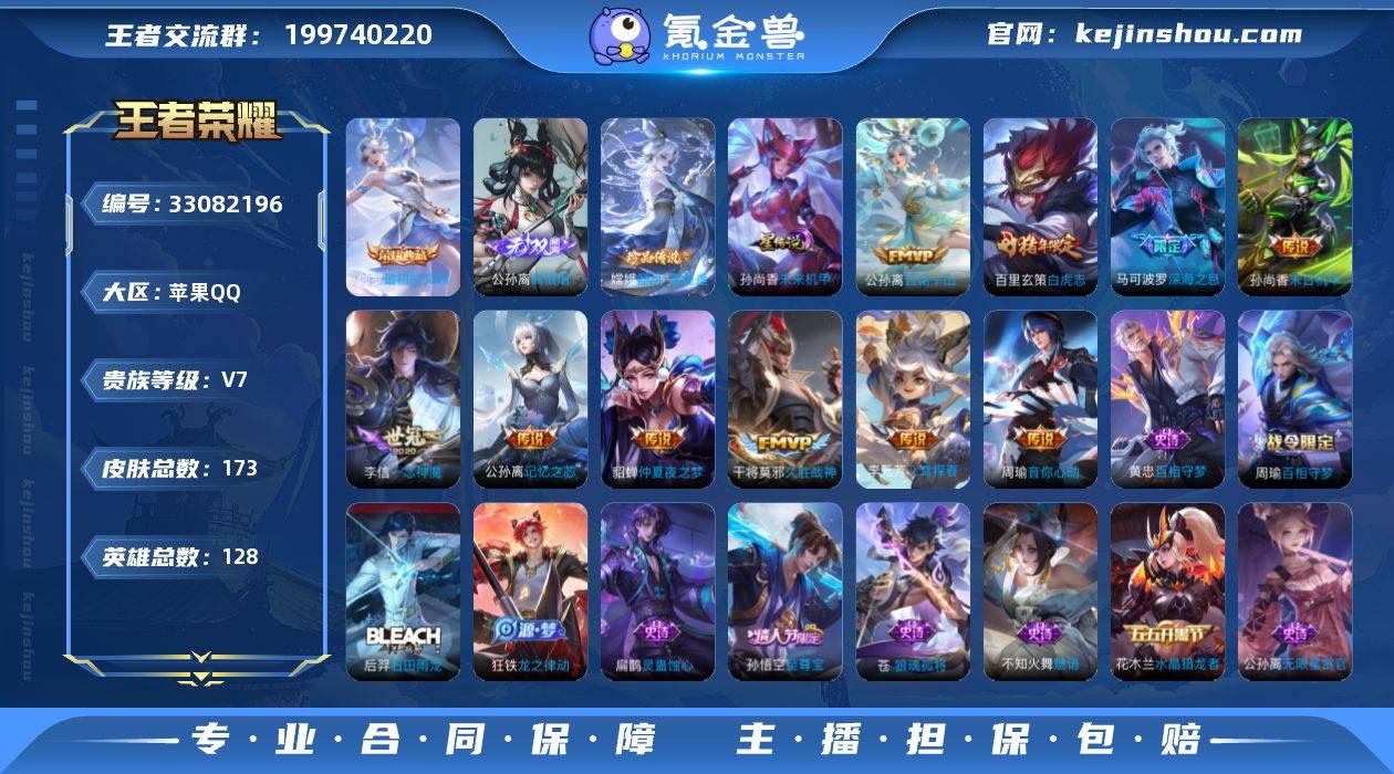 【精品射手号·金标1.1w敖隐·金标1.1w戈娅·金标1.1w蚩奼·金标万战艾琳·金标万战公孙离·金标万战元射·发育路46段·黛西宝灵宝·最初的交响·离恨烟·器灵落星盏·满马年限定·白虎志·愿照山河定·记忆之芯·深海之息·可二次】w23211-苹果Q-128英雄-173皮肤-7王者印记-104铭文-贵族积分3w【贵族7】【1典藏·1无双·1珍品·1星传说·19传说·9按键】【因赛季更新游戏段付以上号为准!】 【英雄全皮】:孙权全皮,苍全皮,敖隐全皮,影全皮 【荣耀典藏】:伽罗最初的交响 【无双皮肤】:公孙离离恨烟 【珍品传说】:嫦娥器灵落星盏 【星元皮肤】:孙尚香未来机甲 【传说皮肤】:云缨神骥越千峰,关羽神骥镇沧海,朵莉亚神骥鸣幻洲,狄仁杰神骥赴朔漠,貂蝉神骥聚万邦,马超神骥逐星野,后羿神树通天,公孙离云诺千山,司空震愿照山河定,桑启鸣野蒿,公孙离记忆之芯,马可波罗深海之息,周瑜音你心动,李元芳飞鸢探春,李信一念神魔,干将莫邪久胜战神,百里玄策白虎志,貂蝉仲夏夜之梦,孙尚香末日机甲 【限定皮肤】:公孙离离恨烟,姜子牙天穹之誓,狄仁杰阴阳师,赵云皇家上将,元歌无心,马可波罗深海之息,狄仁杰魔术师,项羽海滩派对,孙悟空至尊宝,雅典娜黎明之约,百里玄策白虎志,艾琳...