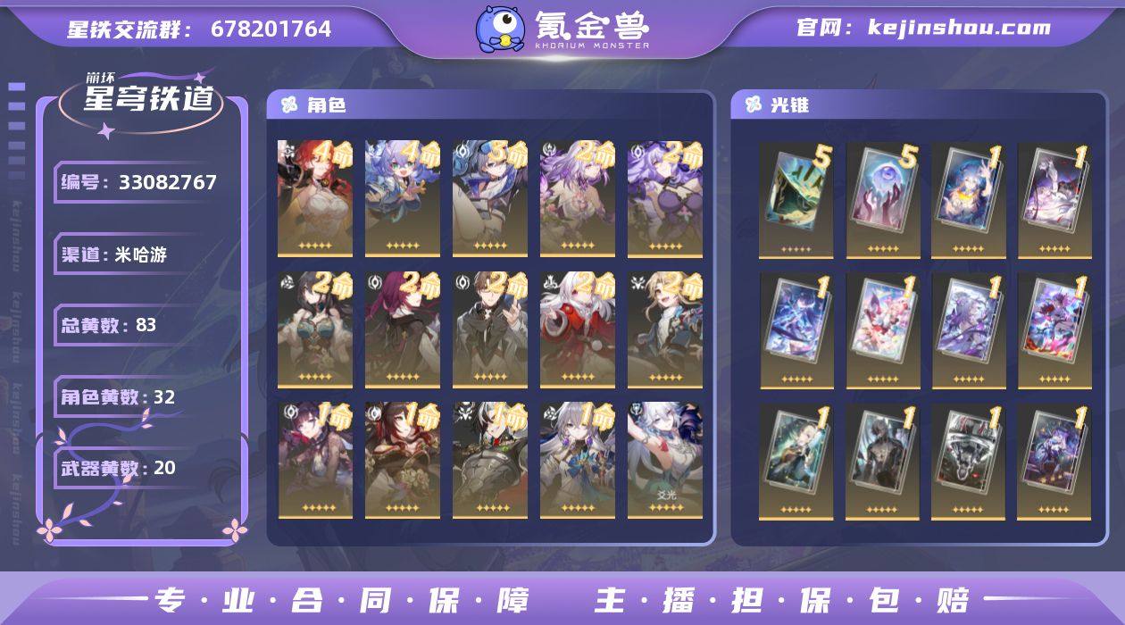 原神崩铁一体号 崩铁五星角色62个,五星光锥24个 原神五星角色58个,五星武器29个 原神号见编号: 33082836