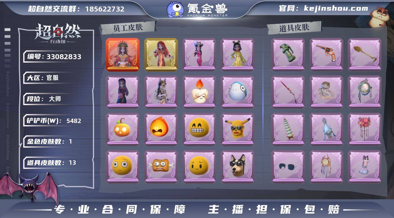 红皮1;金皮1;紫皮4;道具皮13;皮肤:巫铃儿-镜生遗梦,巫铃儿-镜花辞,爱丽丝-丝缕哀歌,小黄-呱呱雨衣,爱丽丝-耀眼的你,薇薇安-白光莹;道具:转轮手枪-新星时代,传送按钮-昆仑镜,长鞭-小狗蛇点点鞭,铲子-龙鳞,葫芦-伏妖塔,音响-鸣沙鼓,夜视仪-金丝眼镜,额外的背包-飞花令,闪光弹-金戈玄铜,黄牛能量饮料-青玉抱丹,桃木剑-凤鸣九天,音响-happy猫,急救包-蔷薇物语;饰品:头饰-烛光纪念,头饰-太空鲨头套,头饰-萨卡班甲鱼头套,头饰-卑微头套,头饰-哈士奇头套,头饰-炙热烧烤,头饰-惊魂南瓜头套,头饰-呆滞头套,头饰-大葱明头套,头饰-嘻嘻头套,头饰-面具马头套,头饰-烈焰红唇头套,头饰-滑稽头套,头饰-火爆了头套,头饰-鱼头怪头套,头饰-咬咬鲨头套,头饰-像素朋克墨镜,头饰-后室幸存者头套,挂饰-钗头凤,背饰-蝶恋花,背饰-牛啤背包;动作:动作-青海摇,动作-新年摇,动作-luvaboy,动作-舞台中心,动作-知世摇,动作-鹏友摇,动作-要糖,动作-抬手,动作-举牌;工牌背景:工牌背景-卷珠帘,工牌背景-永夜巡礼,工牌背景-童话扉页,工牌背景-圣光之誓,工牌背景-冰晶宫,工牌背景-心同野鹤;工牌动作:工牌动作-蜕变,工牌动作-元气剪刀手;员工:小黄,员工-逍遥,员工-爱丽丝,员工-兰,员工-小满,员工...
