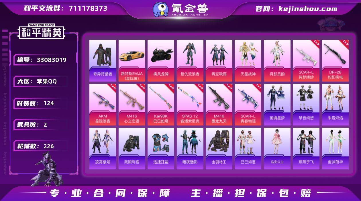 A1637苹果 手Q-5粉装-10特效枪-2载具-4粉色飞行器-67607热力值-2王牌印记-124套装-226枪皮 【热门品类】:套装-奇异狩猎者,套装-金羽特工 【粉色套装】:角色-复仇流浪者,粉装-青空秋雨,粉装-天星战神,角色-月影灵韵,角色-虎痴许褚 【粉色枪皮等级】:AKM-星际浪客(五级),SCAR-L-青春物语(一级),SCAR-L-纯梦嫁纱(六级),M416-心之恋语(五级),M416-墨龙九天(三级),AKS-74U-森灵之息(五级),Kar98K-巳巳如意(五级),Mk14-福马献瑞(五级),SPAS-12-音爆索尼克(五级),DP-28-豹影疾电(五级) 【粉色载具】:路特斯EVIJA(星际黄),疾风龙骑 【粉色枪皮】:AKM-星际浪客,SCAR-L-青春物语,SCAR-L-纯梦嫁纱,M416-心之恋语,M416-墨龙九天,AKS-74U-森灵之息,Kar98K-巳巳如意,Mk14-福马献瑞,SPAS-12-音爆索尼克,DP-28-豹影疾电 【粉色飞行器】:炫彩糖果飞行器,沙丘之主天马,镜域双华-灵镜之阶,万象金身飞行器 【粉色降落伞】:至尊龙雀降落伞,繁花小夜曲降落伞,四圣焕新降落伞,暗夜玫瑰降落伞,碧影闪光降落伞,垂柳戏鸭降落伞,旋转彩虹降落伞,暗夜鎏金降落伞,音爆索尼克降落伞,仲夏莫吉托降落伞,炫光之旅降落伞,沙丘之主降落伞,金丰海韵降落伞,临安公...