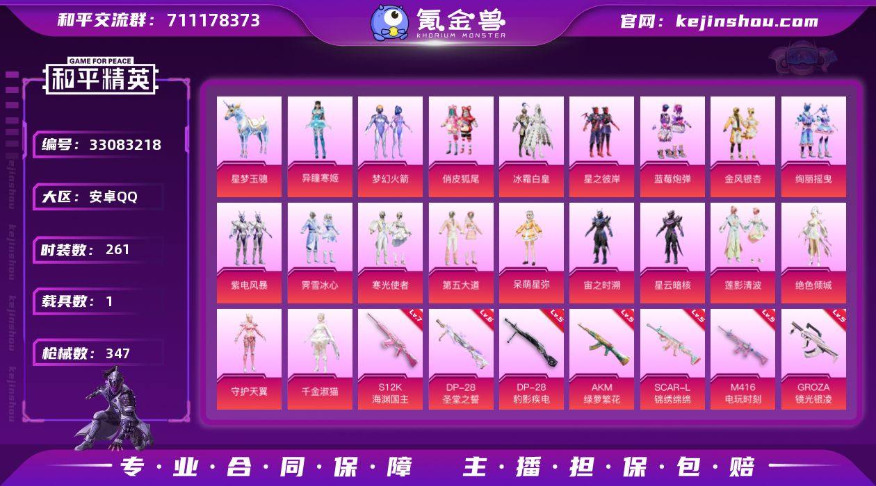 XS264329无二次安卓 手Q-19粉装-11特效枪-1载具-9粉色飞行器-119867热力值-16王牌印记-261套装-347枪皮 【热门品类】:粉装-梦幻火箭,套装-暗夜行者,角色-2B战斗服款,角色-2P战斗服款,套装-龟仙人,角色-8号机,角色-Mark.06 【粉色套装】:粉装-梦幻火箭,粉装-俏皮狐尾,粉装-冰霜白皇,粉装-星之彼岸,粉装-蓝莓炮弹,粉装-金风银杏,粉装-绚丽摇曳,粉装-紫电风暴,粉装-霁雪冰心,粉装-寒光使者,粉装-第五大道,角色-呆萌星弥,角色-宙之时溯,角色-星云暗核,粉装-莲影清波,角色-绝色倾城,角色-守护天翼,角色-千金淑猫,角色-异瞳寒姬 【粉色枪皮等级】:AKM-绿萝繁花(五级),SCAR-L-锦绣绵绵(五级),M416-电玩时刻(五级),GROZA-镜光银凌(五级),AUG-暖羊咩咩(五级),M762-青锋波束(五级),Kar98K-巳巳如意(五级),Kar98K-圣域龙灵(三级),S12K-海渊国主(七级),DP-28-圣堂之誓(六级),DP-28-豹影疾电(五级) 【粉色载具】:星梦玉骢 【粉色枪皮】:AKM-绿萝繁花,SCAR-L-锦绣绵绵,M416-电玩时刻,GROZA-镜光银凌,AUG-暖羊咩咩,M762-青锋波束,Kar98K-巳巳如意,Kar98K-圣域龙灵,S12K-海渊国主,DP-28-圣堂之誓,DP-28-豹影疾电 【粉色飞行器】:炫彩糖果飞...