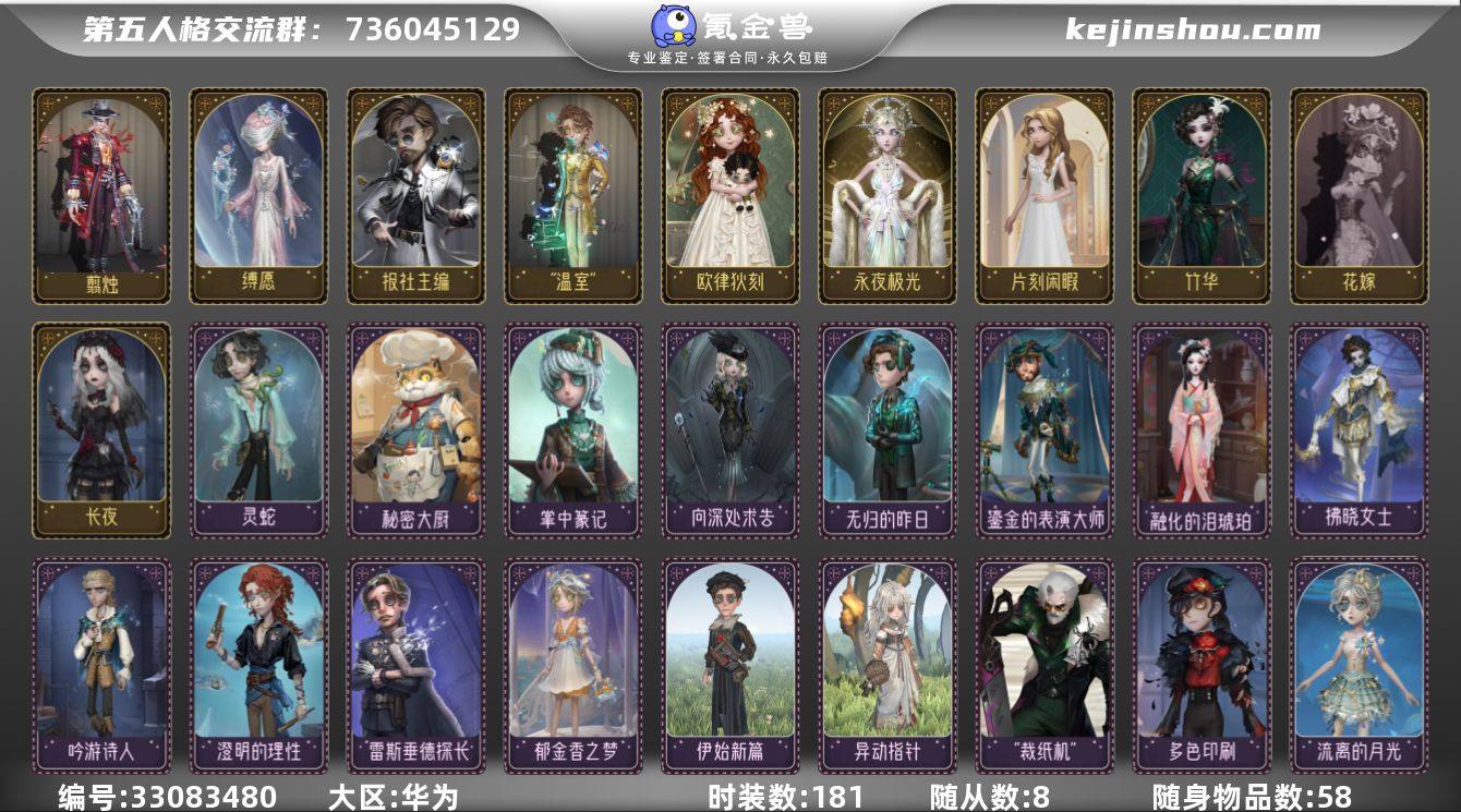 账号类型: 手机账号 时装数: 181 时装: 红蝶-花嫁,红蝶-永夜极光,红蝶-更纱,红蝶-竹华,红夫人-最后一舞,勘探员-矿业董事,冒险家-警醒的龟先生,邮差-琴键,蜘蛛-长腿小姐,“小女孩”-欧律狄刻,红夫人-应许之日,心理学家-长夜,爱丽丝·德罗斯-片刻闲暇,哭泣小丑-灵蛇,魔术师-动力芯,邮差-潘塔龙,佣兵-弦音畸变,入殓师-“温室”,宿伞之魂-桃面书生,摄影师-“琥珀”,蜘蛛-聚光灯下,舞女-流离的月光,画家-多色印刷,冒险家-报社主编,“博士”-“裁纸机”,“小女孩”-异动指针,小说家-“伊始新篇”,园丁-郁金香之梦,大副-雷斯垂德探长,作曲家-澄明的理性,教授-吟游诗人,歌剧演员-拂晓女士,红蝶-融化的泪琥珀,“慈善家”-鎏金的表演大师,“法罗女士”-向深处求告,画家-掌中篆记,26号守卫-秘密大厨,小说家-无归的昨日,昆虫学者-缚愿,杰克-翦烛