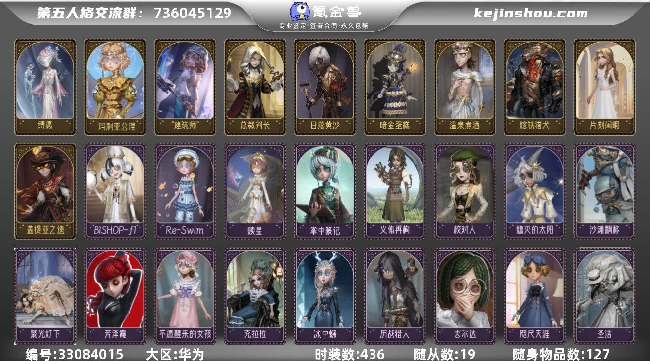 账号类型: 手机账号 时装数: 436 时装: 疯眼-禁闭院长,红蝶-祈雨之女,红夫人-宝钻女爵,“杰克”-绿纹大触,机械师-Re-Swim,机械师-咫尺天涯,祭司-神圣之辉,祭司-冰中蝶,教授-温泉煮酒,空军-怀古,鹿头-熔铁猎犬,魔术师-梅林,魔术师-广津柳浪,盲女-暗金蛋糕,盲女-不愿醒来的女孩,盲女-吉尔达,盲女-"建筑师",梦之女巫-红龙夫人,牛仔-蜡烛人,破轮-球球,“囚徒”-电解,宿伞之魂-安魂曲,摄影师-月下绅士,摄影师-总裁判长,守墓人-日落黄沙,调香师-致命温柔,调酒师-黑玫瑰,先知-历战猎人,医生-炽天使,医生-往昔,医生-采药人,医生-暮辞朝归,“噩梦”-圣洁,“囚徒”-天海兰太郎,幸运儿-星航之旅,调酒师-夜光杯,雕刻家-克拉拉,拉拉队员-BISHOP-f1,勘探员-盖提亚之遗,爱丽丝·德罗斯-片刻闲暇,教授-紧急运输,机械师-纸心,古董商-菌丝研究,舞女-诡焰,“法罗女士”-芳泽霞,蜘蛛-聚光灯下,破轮-沙滩漂移,盲女-玛利亚公理,哭泣小丑-熄灭的太阳,调酒师-校对人,木偶师-义体再构,画家-掌中篆记,盲女-赎星,昆虫学者-缚愿