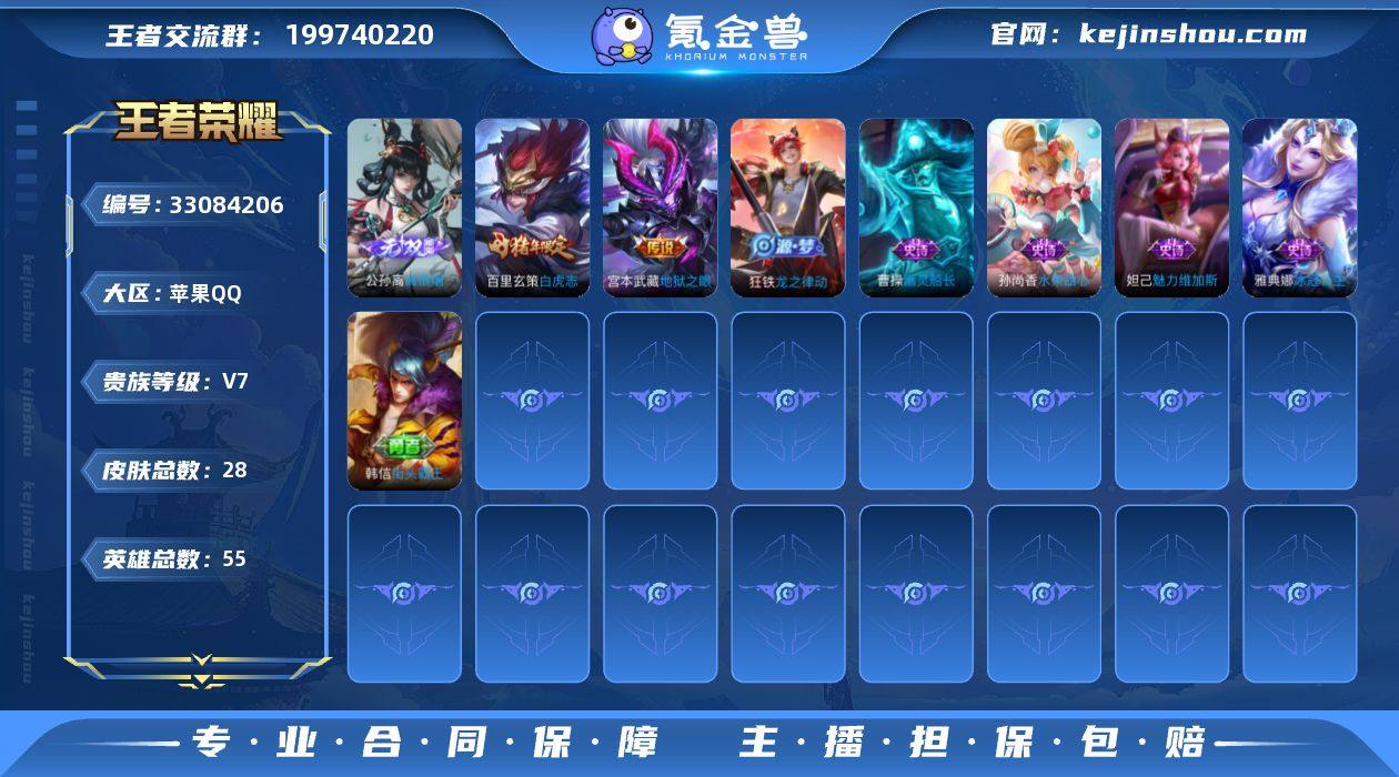 离恨烟·白虎志·神骥赴朔漠·无二次包过】w23291-苹果Q-55英雄-28皮肤-0王者印记-12铭文-贵族积分2w【贵族7】【2无双·4传说·5按键】【因赛季更新游戏段付以上号为准!】 【英雄全皮】:敖隐全皮 【无双皮肤】:李信问心剑,公孙离离恨烟 【传说皮肤】:狄仁杰神骥赴朔漠,后羿神树通天,百里玄策白虎志,宫本武藏地狱之眼 【限定皮肤】:公孙离离恨烟,赵云皇家上将,狄仁杰魔术师,项羽海滩派对,百里玄策白虎志,云中君时之祈愿 【年限皮肤】:百里玄策白虎志 【战令限定】:周瑜线条小狗,小乔线条小狗 【史诗皮肤】:明世隐百晓客,周瑜线条小狗,小乔线条小狗,狂铁龙之律动,云中君时之祈愿,雅典娜冰冠公主,曹操幽灵船长,妲己魅力维加斯,孙尚香水果甜心,狄仁杰魔术师,赵云皇家上将 【其他皮肤】:影百相守梦,艾琳鹤鸣心笺,后羿阿尔法小队,甄姬花好人间,张飞五福同心,亚瑟死亡骑士,典韦黄金武士,韩信街头霸王,项羽海滩派对,马可波罗激情绿茵