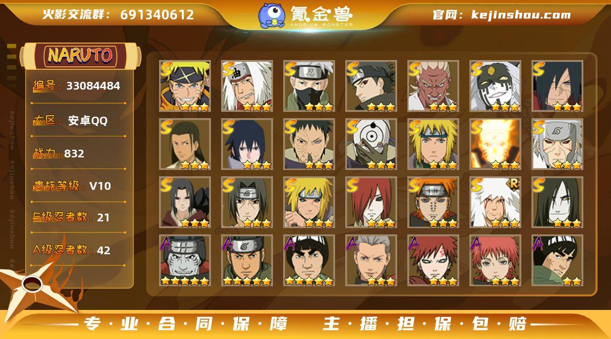 【2735】(可免费转苹果)v10,832w战力,21S级忍者数-42A级忍者数,有熊猫,热门A,侠隐兜,新春小南,漂泊小南,漂泊带土等,忍战樱48片,自来也54片,死门凯47片,最终章80片。ME2278 【S级忍者】:长门「秽土转生」(3星),波风水门「秽土转生」(3星),千手扉间「秽土转生」(3星),宇智波鼬「秽土转生」(3星),宇智波斑「秽土转生·解」(3星),宇智波带土「忍界大战」(3星),艾「忍界大战」(3星),宇智波鼬「须佐能乎」(3星),宇智波止水「须佐能乎」(3星),旗木卡卡西「须佐能乎」(3星),千手柱间「木叶创立」(3星),自来也「舞之豪杰」(3星),大蛇丸(3星),自来也「传说中的三忍」(3星),波风水门(3星),漩涡鸣人「九喇嘛连结」(3星),佩恩「天道」(3星),宇智波佐助「永恒万花筒」(3星),宇智波斑 「白面具」(3星宇智波斑「白面具」),大筒木桃式(3星),漩涡鸣人·宇智波佐助(3星) 【A级忍者】:艾「青年」(2星),波风水门「青年」(2星),大蛇丸「晓」(2星),飞段(3星),飞段「死司凭血」(2星),干柿鬼鲛(5星),漩涡博人「桃式显现」(2星),漩涡鸣人「仙人模式」(2星),漩涡鸣人「九尾查克拉」(2星),迈特凯(5星),旗木卡卡西「忍界大战」(2星),旗木卡卡西「幻之真容」(2星...