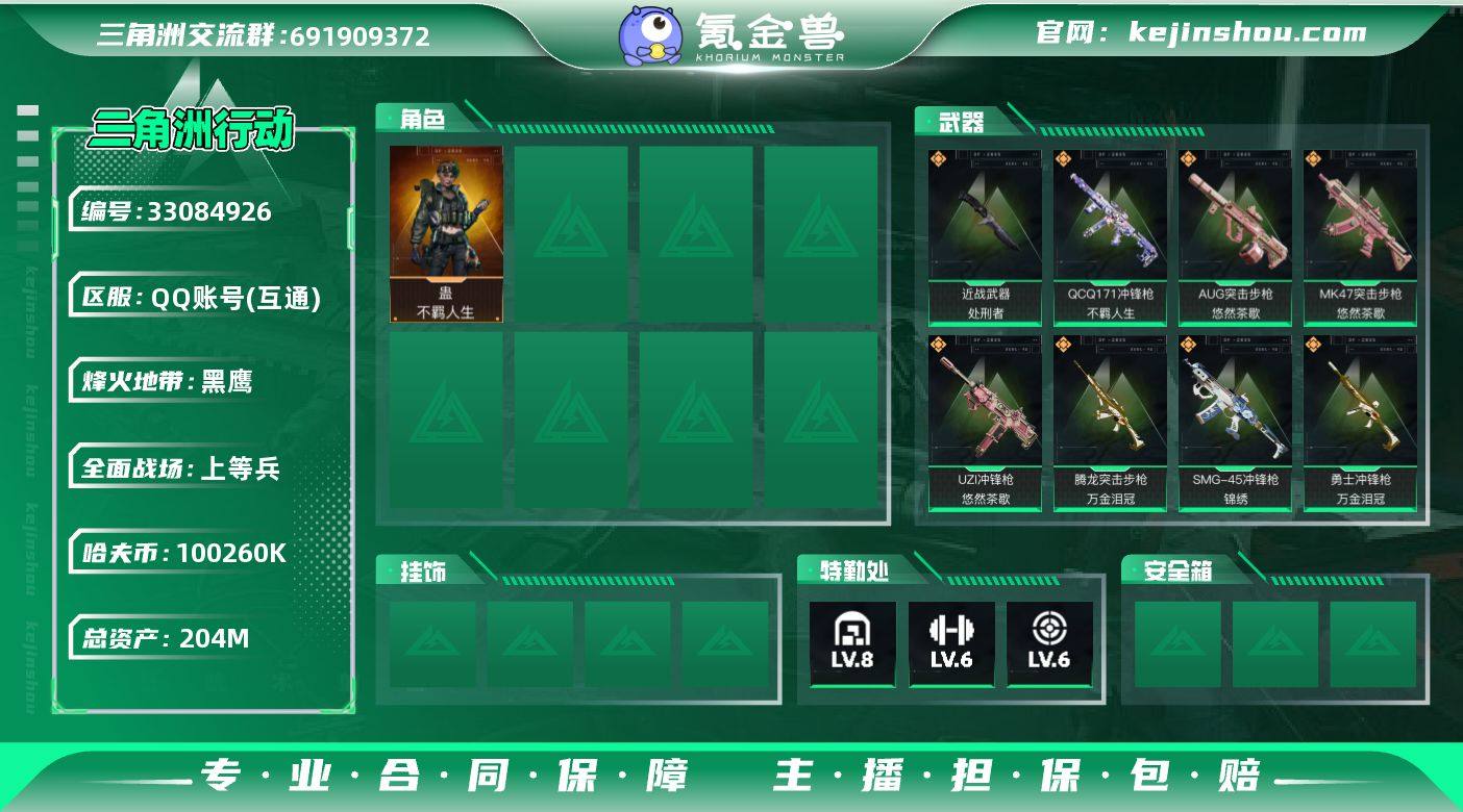 A12478/可二次/QQ区【0封】【总资产:205.3M+100M纯币+60发AWM子弹+近战处刑者+仓库8】/烽火等级:60级/全面战场:17级/纯币:100M/三角券加币:372(三角币40+三角券332)【近战-处刑者】蛊-不羁人生/部门:22322/特勤等级(技术中心3级/工作台3级/制药台3级/防具台3级/仓库8级/指挥中心5级/训练中心6级/靶场6级/潜水中心2级)腾龙突击步枪-万金泪冠/勇士冲锋枪-万金泪冠/AWM狙击步枪-万金泪冠/SMG-45冲锋枪-锦绣/橙色挂饰x6/段位:黑鹰V(流动资产:182.3M)详情看图