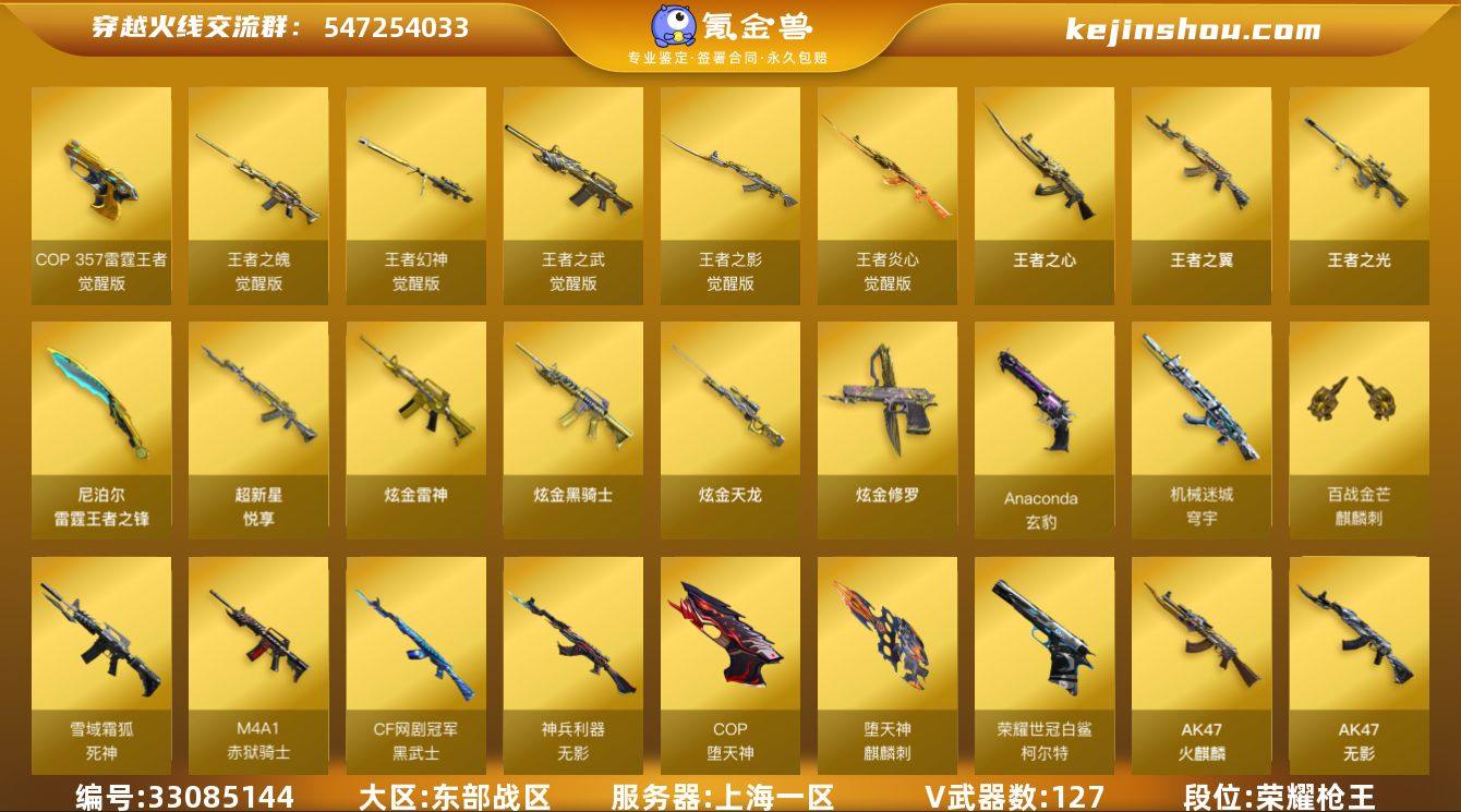 【ky6705】上海一区-142V-17王者武器数-5炫金武器数 【热门武器】:QBZ03-金色蔷薇*2,Scar Light-白虎,HK417-朱雀,M200-幻神,柯尔特-荣耀世冠白鲨2023,M200-竞技荣光,死亡之眼*3,白虎-电玩蓝兔,荣耀世冠-柯尔特,M4A1-黑骑士*4,汤姆逊-烈龙*6,RPK-盘龙*6,加特林-炼狱*6,COP-白鲨,COP-堕天神,沙鹰-修罗*10,炽芒蝶刃-荣耀世冠白鲨2023 皮肤,荣耀世冠-龙啸 【王者炫金武器】:超新星-悦享,王者之翼,王者之心*2,王者之光,雷霆王者之锋,高爆手雷-雷霆王者*2,炫金骑士,炫金雷神*2,炫金天龙,炫金修罗 【音效卡】:屠龙-电竞之星-竞星跃动音效卡,AK47-火麒麟音效卡,M4A1-雷神音效卡,M4A1-黑龙音效卡,M4A1-黑骑士音效卡,Barrett-毁灭音效卡,HK417-朱雀-电竞之星-竞星跃动音效卡,Barrett-碧霄极光音效卡,炼狱-百战金芒-庆典舞曲音效卡,死神-雪域霜狐-怀旧音效卡 【皮肤】:幻神-CFS2022,幻神-荣耀世冠白鲨2023 皮肤,白虎-电玩粉兔皮肤,QBZ03-冠军之薇,金色蔷薇-破浪逐光 皮肤,裁决-巅峰荣耀 皮肤,雷神-暗月,雷神-星空,M4A1-雷神-CFS 2019,雷神-冠军之魄,雷神-荣耀世冠AG,M4A1-再燃火线,火麒麟-冠军之心,火麒麟-战神关羽,火麒麟-巅峰荣...