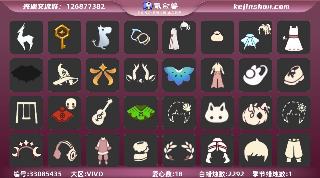 【m1008】区服:VIVO服,登入方式:手机【6季卡】新年裤牛仔裤跑鞋拖鞋耳机鹿角福娃蝙蝠斗秋千茶桌'蜡烛数量:2292爱心:18'当前身高1.985,最高身高1.599'最矮身高13.599'已经毕业地图:雨林,霞谷,已经毕业季节:双星季,姆明季,筑巢季,九色鹿季,稀有礼包:祥云瑞气服饰,彩虹武士裤,阔腿牛仔裤,向日葵连衣裙,玉兔拖鞋,跃动跑鞋,雪人暖心靴,星月头冠,神鹿祝福头饰,彩虹耳饰,彩虹耳机,金鳞耳坠,圣诞鹿角,优雅领结,巫师帽,南瓜头,绊爱套装,贝壳,雪花发卡,玉兔,大桔大利,大耳狗装扮,小狗周年头饰,锦标赛桂冠,AURORA 之翼,新春福娃,蝙蝠斗篷,异彩莲花斗篷,盘龙围巾斗篷,音韵吉他,情人秋千,情人小船,茶桌,鹊桥相会礼包,活力海牛套装,粽子头饰,小黄鸭头饰,青衫落拓礼包,小黄鸭雨衣套装,热门物品:蝴蝶结,公主头,正太头,樱花头,猫猫头,搓澡巾,武士裤,白棉裤,背带裤,花环头饰,宴会围巾,虚荣发型,红耳机,黄鼠狼面具,花瓣斗篷,灯泡斗篷,红金斗篷,白金斗篷,白鸟斗篷,吉他,尤克里里,笛子,雨伞