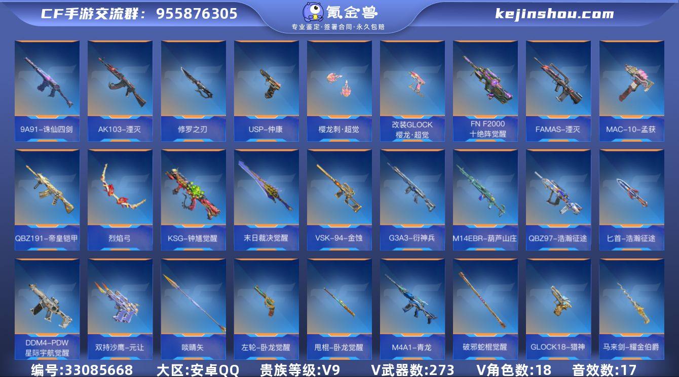 暗区突围AQ7FE2 号 会员5,7近战(7金),12角色皮(3金9紫),116武器皮肤(17金99紫),仓库价值149M,科恩币118281k, 冥河,深潜行者II,绅士西服,枪皮:伸冤者迷踪M4A1,林中人FAL,堕落者H416,蓝色咆哮H416,乌金黑曜QBZ192,旧王圣谕QBZ191,浮鳞影青QBZ192,伦琴幻影FAL,包络战术AKM,旗帜AEK,镀火熔金H416,利齿风暴MPX,黑金弹头P90,骑士之剑VSS,棱光裂变QBU191,骑士之剑AX50,近卫荣誉RPK16。出暗区突围和cfm和平精英和王者连体号这个月截止,价格可议。安卓q区13年的qq老号年svip9皇冠,还有各种别的vip。以及,急出暗区突围和cfm极品号,枪皮加刀皮加收藏品,还有仓库的现金和整枪如图所示,光这个号一共充了7475。图太多放不上来请需要的老板亲自来验号。价格可议。cfm充值五万六贵族9,七套王者至尊套和一些强力三国武器还有近战,以及各种女团夺宝皮肤熔岩夺宝皮肤万化音效卡角色等等,号里七王雷套全套皮,火皮王力火皮王幻,81瑜,ak奉先,m4星象等等。已经是相当实惠的价了。带二次!