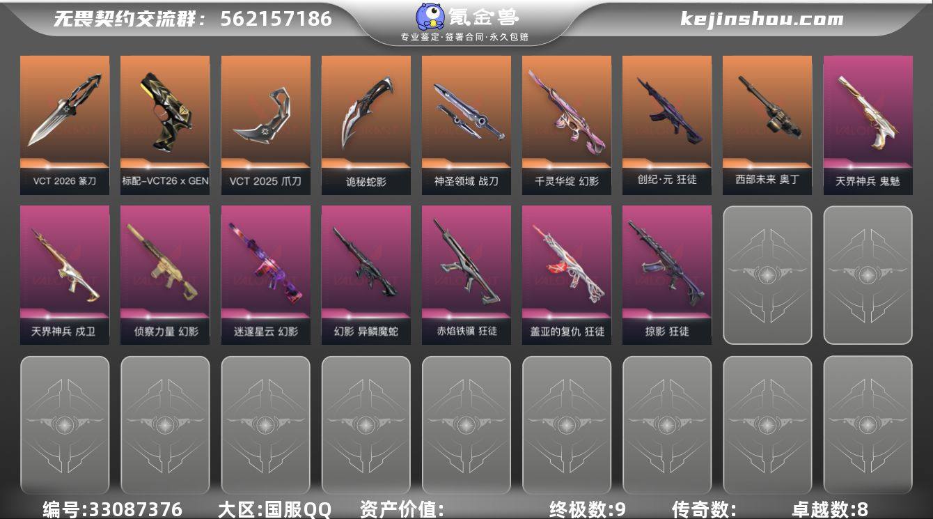 w4976 【性价比】荆棘狂徒 异鳞幻影 天界鬼魅 莲花幻影 vct篆刀 赤焰狂徒 掠影狂徒 天界戍卫 盖亚狂徒 侦查幻影 西部奥丁 vct爪刀 神圣战刀 迷邃幻影 创纪元狂徒 库存: 25930剩余VP:96剩余R点:35 段位:白银2历史最高:黄金2