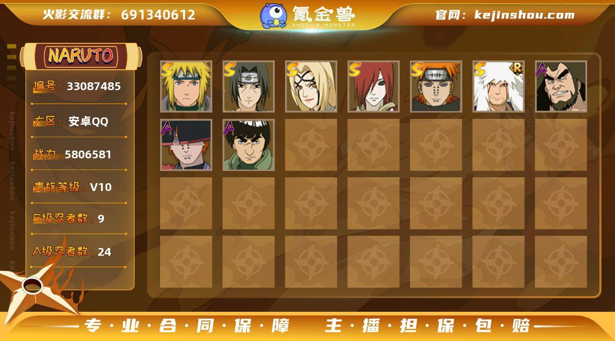 安卓QQ-可改二次-v10-马斑差10片-多个直购a忍-熊猫等-S忍者数:9- A忍者数:24小南「新春限定」(2星),波风水门「新春限定」(2星)照美冥「侠隐江湖」(2星),佩恩·六道「漂泊浪客」(2星)神秘面具男「忍者之路」(2星)小南「漂泊浪客」(2星) 【S级忍者】长门「秽土转生」(3星),千手扉间「秽土转生」(3星),自来也「舞之豪杰」(3星),宇智波鼬「须佐能乎」(3星),漩涡鸣人·宇智波佐助(3星),佩恩「天道」(3星),宇智波斑「五影会谈」(3星),波风水门(3星),纲手「百豪」(3星), 【A级忍者】宇智波佐助「须佐能乎」(2星),大蛇丸「晓」(2星),小南「新春限定」(2星),波风水门「新春限定」(2星),黑土「四代目土影」(2星),宇智波泉奈(2星),神农「羁绊」(2星),干柿鬼鲛(2星),猿飞阿斯玛(3星),迈特凯(3星),蝎(3星),飞段「死司凭血」(2星),照美冥「侠隐江湖」(2星),佩恩·六道「漂泊浪客」(2星),日向雏田「最终章」(2星),不缘(2星),长十郎「六代目水影」(2星),神秘面具男「忍者之路」(2星),宇智波佐助「万花筒写轮眼」(2星),旗木卡卡西「神威对决」(2星),小南「漂泊浪客」(2星),漩涡博人「桃式显现」(2星),迈特凯「青春爆炸」(2星),机械鸣人「初始形态」(2星),
