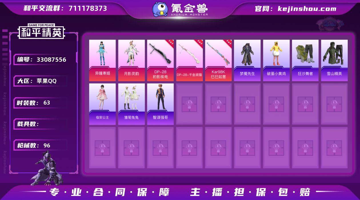 crhp43+可二次【狂沙 身法口罩2粉 4特】苹果手Q-2粉装-4特效枪-63套装-96枪皮-4王牌印记-坚韧铂金Ⅲ-27805热力值【2粉装】角色-月影灵韵,角色-异瞳寒姬【4特效枪】DP-28-千金淑猫[6级],DP-28-豹影疾电[2级],Mk14-福马献瑞[4级],Kar98K-巳巳如意[5级]【2稀有】狂沙舞者,AKM-奇异狩猎者【8飞行器】登顶巅峰飞行器,异域银装飞行器,顶峰精英尾迹,鸡智如我飞行器,狂鲨锋刃飞行器,招财竹蜻蜓飞行器,炫彩糖果飞行器,马上有福飞行器【1头盔】梦幻火箭头盔【151其它衣服和枪皮】巳巳如意,秘语星愿,角色-摩登魅猫,棉花软糖,角色-临安公主,森林游猎者,完美偶像,街头风暴,青涩时光,粉黛兰香,SS34特训,糖糖葫芦,冰河战士,燕燕于飞,炫彩糖果,深蓝色名流,SS31特训,青团波波,玩偶服-美羊羊,SS37特训,梦魇先生,蝶变,香桃花海,旭日情侣,龙魂突击队,王牌教练,冰川特警,薄荷星砂,龙的传人,雏菊兔兔,战术大师,SS29特训,老实芭蕉,海岛探路者,柠萌假日,星途旅人,SS30特训,角色-绯色魅影,SS35特训,特战装甲,雪山精英,黄色名流,魅力单车,SS36特训,午间小调,狙击之神,智谋强哥,萝兰蝴蝶,萌鸡速递,雪国风尚,风迹短诗,鱼渊荷华,角色-都市丽猫,竞技名士,破蛋小黄鸡,凌霄紫焰,朱霞炽焰,破晓战魂,疯狂小兔子,擎...