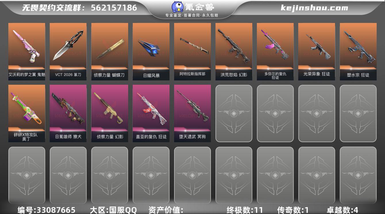 【948355】【套装】:VCT 2026 赛季套装 【英雄】:幻棱,炼狱,维斯,暮蝶,钛狐,壹决,铁臂,捷风,雷兹,幽影,不死鸟,贤者,猎枭,蝰蛇,零,芮娜,奇乐,尚勃勒,霓虹,斯凯,夜露,星礈,K/O,海神,盖可,黑梦,钢锁 【近战武器】:近战武器-VCT 2026 篆刀,近战武器-侦察力量 蝴蝶刀,近战武器-剥皮小刀,近战武器-日耀风暴 遗器,近战武器-阿特拉斯指挥部 甩棍 【狂徒】:狂徒-塑水宗,狂徒-光荣异象,狂徒-多弥尔的复仇,狂徒-盖亚的复仇,狂徒-神罚//2.0 【幻影】:幻影-洪荒怒焰,幻影-侦察力量 【獠犬】:獠犬-日冕雄师 【冥驹】:冥驹-堕天遗武 【奥丁】:奥丁-砰砰X特攻队 【标配】:标配-神罚 【鬼魅】:鬼魅-艾沃莉的梦之翼 【卡面】:零点嗅探设计图 卡面,无畏契约GO!第一卷:芮娜 卡面,无畏契约GO!第一卷:零 卡面,代号红色 卡面,新兵报到 卡面,V契约 卡面,无畏契约 卡面 【喷漆】:双击点赞 喷漆,买装还是存钱 喷漆,胜利属于无畏契约 喷漆,GLHF 喷漆,无畏契约 喷漆 【挂饰】:无畏契约GO!第一卷 芮娜 挂饰,无畏契约GO!第一卷 零 挂饰,天外飞客 挂饰,无畏契约 纪念币 挂饰