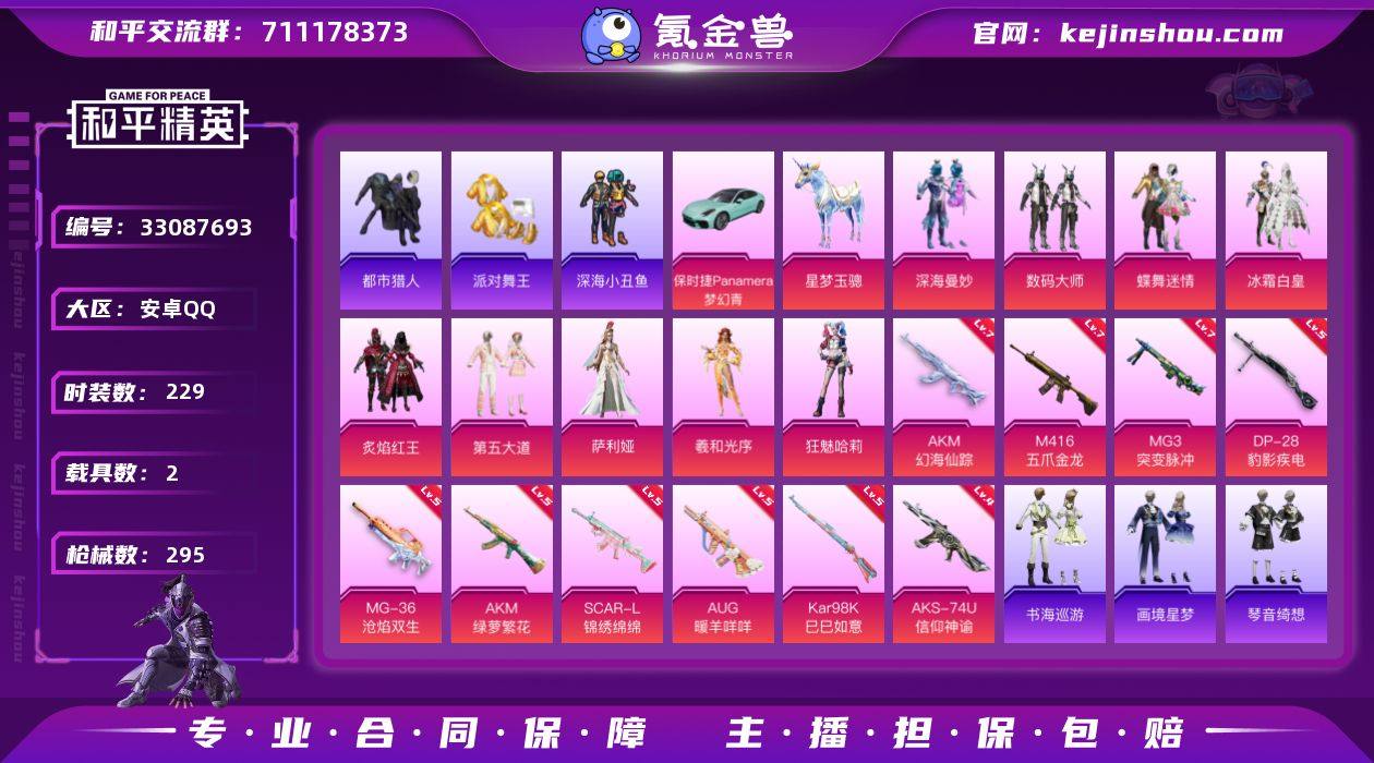 安卓 手Q-9粉装-14特效枪-2载具-4粉色飞行器-89159热力值-16王牌印记-229套装-295枪皮 【热门品类】:套装-浪漫天命,套装-都市猎人,套装-派对舞王,套装-深海小丑鱼,套装-小丑鱼,套装-忍者信条,套装-龟仙人,套装-暗影哥特,套装-粉红小猪 【粉色套装】:粉装-深海曼妙,粉装-数码大师,粉装-蝶舞迷情,粉装-冰霜白皇,粉装-炙焰红王,粉装-第五大道,角色-萨利娅,角色-羲和光序,角色-狂魅哈莉 【粉色枪皮等级】:AKM-绿萝繁花(五级),AKM-幻海仙踪(七级),SCAR-L-锦绣绵绵(五级),M416-五爪金龙(七级),AUG-暖羊咩咩(五级),ACE32-萌骑漫游(四级),AKS-74U-信仰神谕(四级),AKS-74U-森灵之息(五级),Kar98K-巳巳如意(五级),Mk14-福马献瑞(五级),DP-28-豹影疾电(五级),MG3-突变脉冲(七级),MG-36-沧焰双生(五级) 【粉色载具】:保时捷Panamera(梦幻青),星梦玉骢 【粉色枪皮】:AKM-绿萝繁花,AKM-幻海仙踪,SCAR-L-锦绣绵绵,M416-五爪金龙,AUG-暖羊咩咩,ACE32-萌骑漫游,AKS-74U-信仰神谕,AKS-74U-森灵之息,Kar98K-巳巳如意,Mk14-福马献瑞,DP-28-豹影疾电,MG3-突变脉冲,MG-36-沧焰双生,破片手榴弹-贪吃小熊 【粉色飞行器】:炫彩糖果飞行器,齐天大圣...