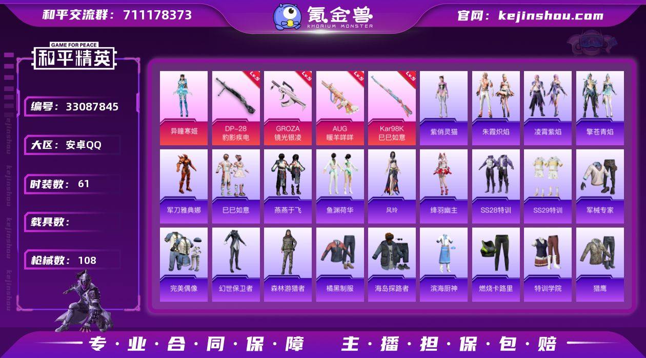 安卓 手Q-1粉装-5特效枪-0载具-0粉色飞行器-25743热力值-4王牌印记-61套装-108枪皮 【热门品类】:角色-军刀雅典娜 【粉色套装】:角色-异瞳寒姬 【粉色枪皮等级】:GROZA-镜光银凌(五级),AUG-暖羊咩咩(五级),Kar98K-巳巳如意(五级),Mk14-福马献瑞(一级),DP-28-豹影疾电(五级) 【粉色枪皮】:GROZA-镜光银凌,AUG-暖羊咩咩,Kar98K-巳巳如意,Mk14-福马献瑞,DP-28-豹影疾电 【粉色降落伞】:精灵梦叶罗丽降落伞,鬼刀降落伞,炫彩糖果降落伞 【稀有套装】:套装-巳巳如意,套装-马上有钱,套装-迅捷龙虾,套装-燕燕于飞,套装-鱼渊荷华,角色-风玲,角色-绛羽幽主,套装-朱霞炽焰,套装-凌霄紫焰,套装-擎苍青焰,角色-紫俏灵猫 【稀有枪皮】:AKM-破晓战魂,AKM-龙的传人,M16A4-红色方程式,M16A4-蓝色火焰,SCAR-L-夜灯,SCAR-L-炫彩节奏,SCAR-L-红色方程式,M416-红色方程式,M416-蓝色火焰,AUG-耀粉歌者,蜜獾-虎痴许褚,ACE32-蓝晶绮麟,ARX-凌霄紫焰,UZI-天降萌叽,UZI-红色方程式,UMP45-夜灯,UMP45-蓝色火焰,汤姆逊-炫彩节奏,汤姆逊-耀粉歌者,汤姆逊-像素花束,JS9-凌霄紫焰,P90-巳巳如意,Kar98K-红色方程式,VSS-星之彼岸,Mini14-耀粉歌者,S686-生...