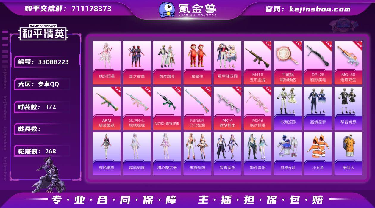 安卓 手Q-5粉装-11特效枪-0载具-2粉色飞行器-74331热力值-16王牌印记-172套装-268枪皮 【热门品类】:套装-浪漫天命,套装-小丑鱼,套装-龟仙人,角色-Mark.06 【粉色套装】:角色-绝对恒星,粉装-星之彼岸,粉装-筑梦精灵,玩偶服-猪猪侠,粉装-星穹咏叹调 【粉色枪皮等级】:AKM-绿萝繁花(五级),SCAR-L-锦绣绵绵(五级),M416-五爪金龙(七级),M762-青锋波束(五级),Kar98K-巳巳如意(五级),Mk14-甜梦熊击(五级),Mk14-福马献瑞(一级),M249-绝对恒星(四级),DP-28-豹影疾电(五级),MG-36-沧焰双生(五级),平底锅-桃粉嫣然(七级) 【粉色枪皮】:AKM-绿萝繁花,SCAR-L-锦绣绵绵,M416-五爪金龙,M762-青锋波束,Kar98K-巳巳如意,Mk14-甜梦熊击,Mk14-福马献瑞,M249-绝对恒星,DP-28-豹影疾电,MG-36-沧焰双生,平底锅-桃粉嫣然 【粉色飞行器】:绝对恒星飞行器,炫彩糖果飞行器 【粉色降落伞】:绝对恒星降落伞,甜心宝贝降落伞,星之彼岸降落伞,葫芦兄弟降落伞,青空秋雨降落伞,忍者神龟降落伞,千金淑猫降落伞,樱桃泡泡降落伞,荧海星豚降落伞,炫彩糖果降落伞 【稀有套装】:套装-龟仙人,套装-巳巳如意,角色-超感刻度,角色-甜心蒙太奇,套装-雪国风尚,套装-炫彩...