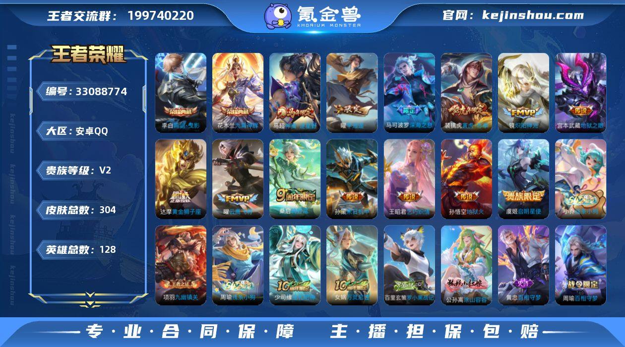 实名: 可修改 性别: 男号 贵族等级: V2 英雄数: 128 皮肤数: 304 荣耀水晶: 鸣剑·曳影,九霄神辉 传说皮: 黄金狮子座,云鹰飞将,炽阳神光,地狱火,地狱之眼,李逍遥,乞巧织情,末日机甲-孙策,神骥·逐星野 限定皮: 冰锋战神,李小龙,梁祝,白晶晶,寅虎·御盾,一生所爱,高山流水,孙行者,匿光追影者,傲雪梅枪,寅虎·赤拳,深海之息,五谷丰年,鸣野蒿 亮点: 【优质装备】:鸣剑·曳影,九霄神辉(木兰典藏),黄金狮子座,云鹰飞将(小将军),炽阳神光,地狱火,地狱之眼,李逍遥,乞巧织情,末日机甲-孙策,涂山容容