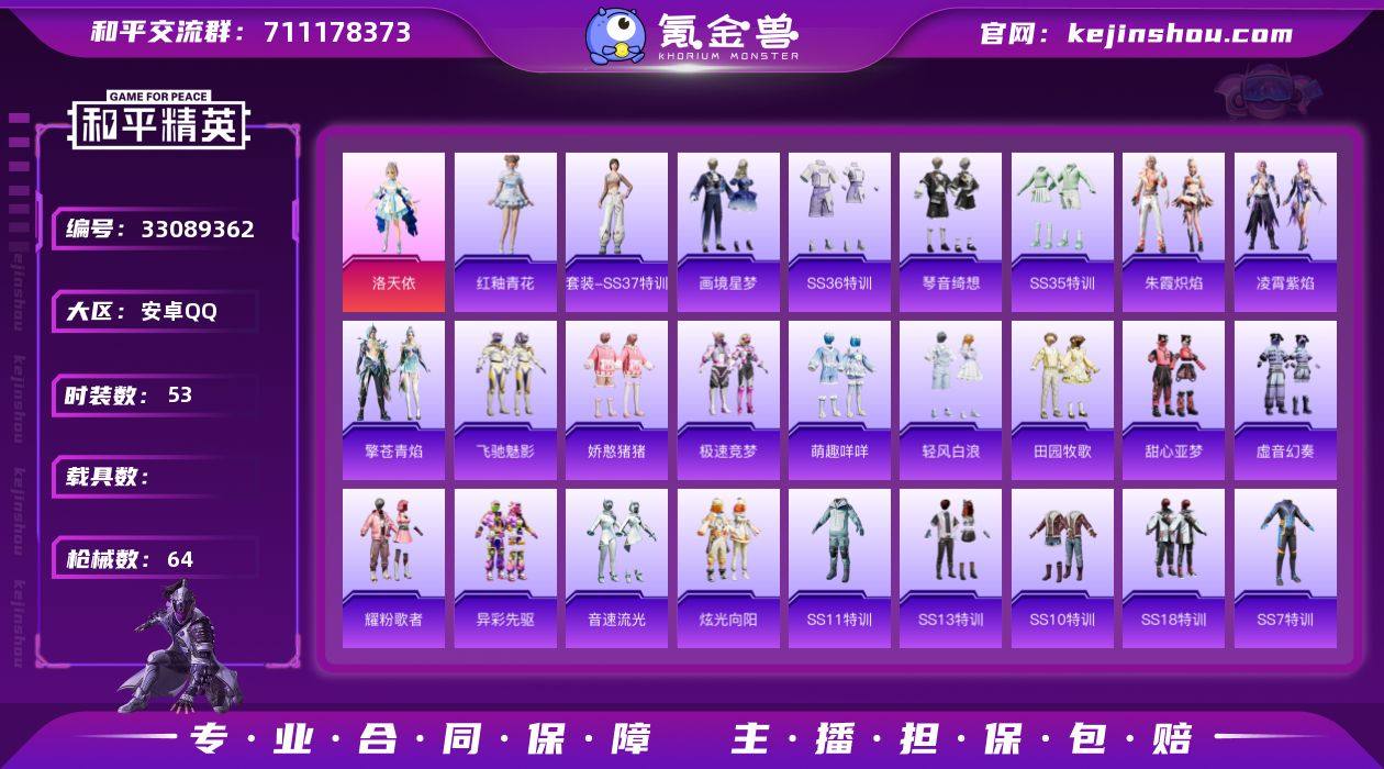【和平精英】1粉装,5特效枪,0载具,历史最高段位:卓越王牌12星 王牌印记13次 热力值:53394,162套装,182枪械,174装备,98战备;套装:角色-洛天依,套装-特训学院,套装-猎鹰,套装-青年教官,套装-橘黑制服,套装-红色运动,套装-黄色运动,套装-蓝色运动,套装-黄色伏地魔,套装-白色伏地魔,套装-黑色伏地魔,套装-骑行爱好者,套装-竞技名士,套装-深蓝色名流,套装-酒红色名流,套装-湖蓝色名流,套装-黄色名流,套装-猛禽,套装-长空猛禽,套装-漫步者,套装-竞技勇士朋克,套装-海岛探路者,套装-旭日情侣,套装-冷焰舞者,套装-灼焰舞者,套装-刚毅裁决者,套装-战地菁英,套装-战地督导,套装-甜蜜告白,套装-燃烧卡路里,套装-鹰眼刺客,套装-冰冻风暴,套装-完美偶像,套装-人气偶像,套装-幻影武者,套装-海滨突袭者,套装-街头潮人,套装-暗金炫舞,套装-蓝彩潮人,套装-魅力单车,套装-绮丽涂鸦,套装-雪山征服者,套装-坚韧舞者,套装-竞技达人朋克,套装-夜莺强袭者,套装-野性战心,套装-破晓战魂,套装-森林游猎者,套装-都市魅力,套装-热血青春,套装-潮流炫酷,套装-沙漠兵团,套装-SS2特训,套装-雪山精英,套装-幻世战舞者,套装-甜蜜熊情侣,套装...