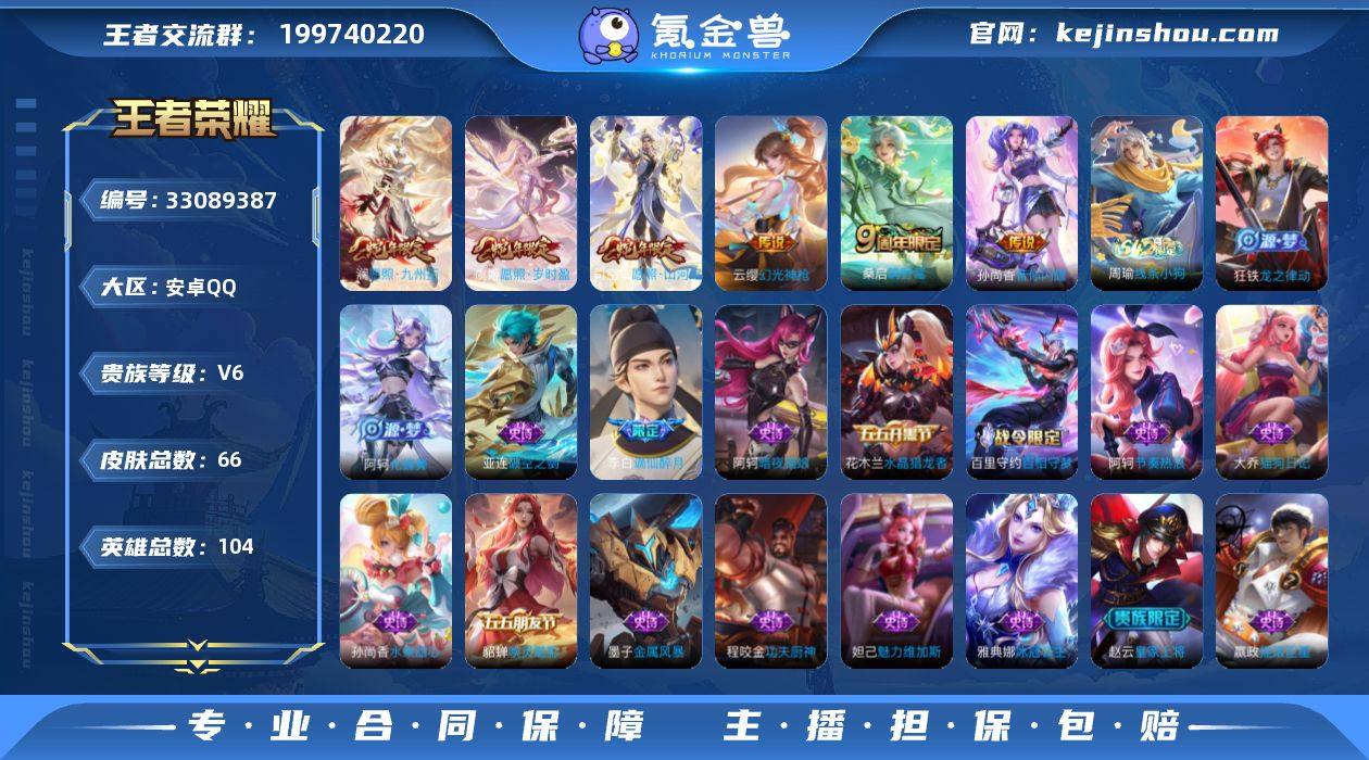 安卓Q-V0-尊贵铂金IV段位-104英雄-66皮肤-6传说-17史诗 【传说皮肤】:司空震愿照山河定,澜愿照九州拓,虞姬愿照岁时盈,云缨幻光神枪,桑启鸣野蒿,孙尚香音你闪耀 【限定皮肤】:姜子牙天穹之誓,李白谪仙醉月,狄仁杰阴阳师,赵云皇家上将,项羽海滩派对,鲁班大师探海日志,张良古海寻踪,鬼谷子天穹祈灯,沈梦溪龙舞盛年,刘邦剑破天穹,程咬金群星魔术团,周瑜熔金海岸 【年限皮肤】:司空震愿照山河定,澜愿照九州拓,虞姬愿照岁时盈 【赛季限定】:鲁班大师探海日志,张良古海寻踪,鬼谷子天穹祈灯,刘邦剑破天穹,姜子牙天穹之誓,东皇太一噬灭天穹,太乙真人谧流熔炉,钟馗虚灵犬护 【战令限定】:亚连破空之剑,孙悟空神迹守卫,百里守约百相守梦,老夫子百相守梦,周瑜线条小狗 【史诗皮肤】:周瑜线条小狗,狂铁龙之律动,阿轲化蝶舞,百里守约百相守梦,李白谪仙醉月,亚连破空之剑,貂蝉唤灵魅影,大乔猫狗日记,阿轲节奏热浪,程咬金功夫厨神,雅典娜冰冠公主,花木兰水晶猎龙者,墨子金属风暴,妲己魅力维加斯,嬴政摇滚巨星,孙尚香水果甜心,赵云皇家上将,阿轲暗夜猫娘 【其他皮肤】:露娜命运加冕,钟馗虚灵犬护,戈娅玫蓝誓约,达摩爆裂喵拳,西施雪境...