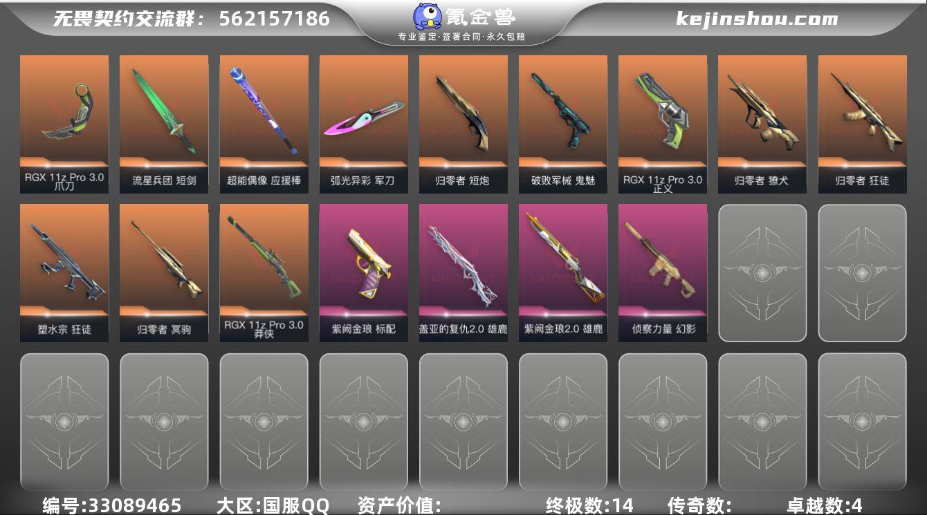 【346】【套装】:RGX 11z Pro//3.0套装,归零者套装 【英雄】:炼狱,维斯,暮蝶,钛狐,壹决,铁臂,捷风,雷兹,幽影,不死鸟,贤者,猎枭,蝰蛇,零,芮娜,奇乐,尚勃勒,霓虹,斯凯,夜露,星礈,K/O,海神,盖可,黑梦,钢锁 【近战武器】:近战武器-剥皮小刀,近战武器-RGX 11z Pro//3.0 爪刀,近战武器-流星兵团 短剑,近战武器-超能偶像 应援棒,近战武器-弧光异彩 军刀,近战武器-生物收割器 【狂徒】:狂徒-归零者,狂徒-塑水宗,狂徒-超能偶像,狂徒-弧光异彩,狂徒-流星兵团 【幻影】:幻影-侦察力量,幻影-噬源兽防卫工程,幻影-聚合之力 【戍卫】:戍卫-超能偶像,戍卫-彩梦之城,戍卫-沙场老兵,戍卫-战术熊与伙伴们 【獠犬】:獠犬-归零者,獠犬-弧光异彩,獠犬-采蜜小蜂队 【冥驹】:冥驹-归零者 【飞将】:飞将-聚合之力,飞将-信手涂鸦,飞将-战术熊与伙伴们 【莽侠】:莽侠-RGX 11z Pro//3.0,莽侠-纤云弄巧 【战神】:战神-采蜜小蜂队 【奥丁】:奥丁-流星兵团,奥丁-信手涂鸦 【判官】:判官-超能偶像,判官-采蜜小蜂队 【雄鹿】:雄鹿-盖亚的复仇//2.0,雄鹿-紫阙金琅//2.0,雄鹿-彩梦之城 【骇灵】:骇灵-流星兵团,骇灵-信手涂鸦 【蜂刺】:蜂刺-...