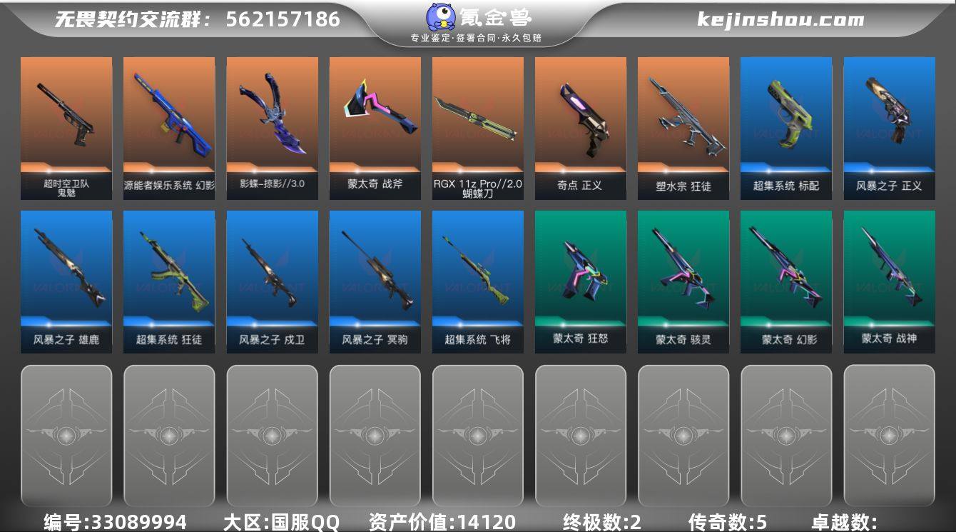 段位: 未定级 近战武器皮肤: RGX 11z Pro//2.0 蝴蝶刀,蒙太奇 战斧,影蝶-掠影//3.0 步枪皮肤: 狂徒-塑水宗,幻影-源能者娱乐系统,超集系统 狂徒,蒙太奇 幻影,风暴之子 戍卫 佩枪皮肤: 正义-奇点,鬼魅-超时空卫队,超集系统 标配,风暴之子 正义,蒙太奇 狂怒 狙击枪皮肤: 风暴之子 冥驹,超集系统 飞将 冲锋枪皮肤: 蒙太奇 骇灵 霰弹枪皮肤: 风暴之子 雄鹿 机枪皮肤: 蒙太奇 战神 亮点: 【优质装备】:正义-奇点,狂徒-塑水宗,幻影-源能者娱乐系统,RGX 11z Pro//2.0 蝴蝶刀