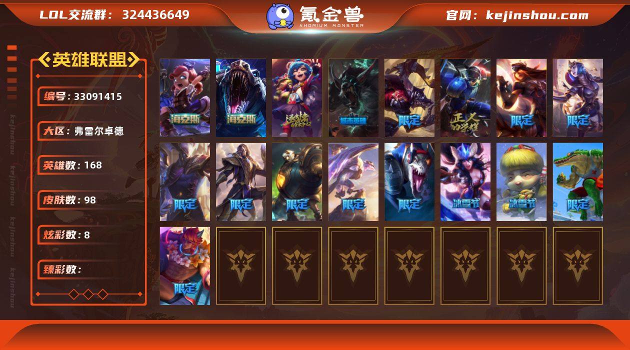 未定级段位-168英雄-98皮肤-8炫彩-0终极-4神话-15限定-11传说-19史诗 【神话皮肤】:十周年纪念安妮,神凰行者瑞羽圣凰艾尼维亚 【海克斯皮肤】:海克斯科技安妮,海克斯科技雷克顿 【冰雪限定】:冰雪风暴希维尔,圣诞开心鬼提莫 【限定皮肤】:SKTT1雷克顿,胜利女神希维尔,胜利女神奥莉安娜,胜利之剑亚托克斯,胜利枪神卢锡安,胜利机器人布里茨,胜利凤凰艾尼维亚,鬼影森森茂凯,泳池派对雷克顿,泳池派对瑟提,暗影沃里克,都铎王朝图奇,防暴天使凯尔 【传说皮肤】:大天使长米迦勒凯尔,恶魔男爵瑞兹,霸天零式赛恩,恶魔之刃泰达米尔,战地巨兽科加斯,律政大亨蒙多,电玩女神娑娜,战斗学院伊泽瑞尔,黯黑魔龙希瓦娜,焰尾妖狐阿狸,苍穹之光韦鲁斯 【史诗皮肤】:科学怪熊的新娘安妮,铁血剑豪易,战场公主希维尔,圣洁化身索拉卡,百夫长贾克斯,少林武僧贾克斯,穿着正装的恶魔维迦,海贼魅影卡特琳娜,灵魂烈焰布兰德,至高之拳李青,生化博士黑默丁格,血色之锤波比,飞车暴走族古拉加斯,帝王斑蝶克格莫,深海怪鱼克格莫,侏罗纪化石克格莫,腥红之月鬼武者慎,邪恶魔人扎克,黑帮狂花金克丝 【勇士皮肤】:烈焰猛士奥拉夫 【其他皮肤】:哞利斯塔,武仙座...