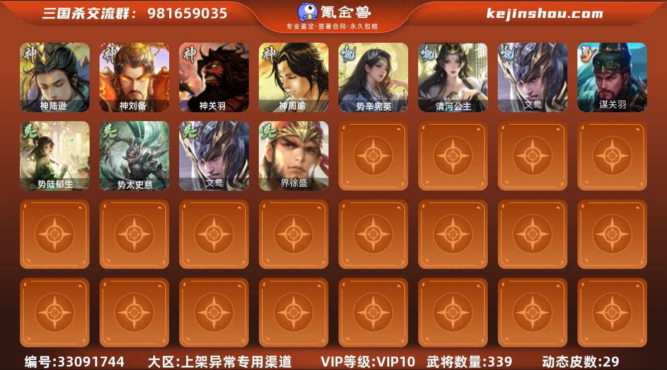 【苹果官服V10大将军】个人一手号,活绑可秒换绑,永久包赔! ✅核心武将:36个史诗将,含谋关羽、势魏延、文鸯、势太史慈、界徐盛等T0强将 ✅核心资源:19509心愿积分(准2万,可换神郭嘉/刘焉/神姜维),将魂1.1万+,8个月月卡已充 ✅外观收藏:29款热门动态皮肤,含圣垂千古双形态等优质限定 ✅账号状态:文明分100,无封禁,无找回记录,诚心出,可小刀!