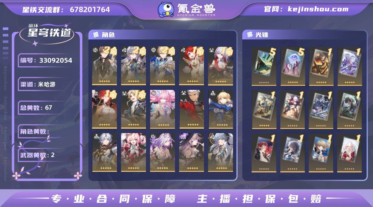 总黄数: 67 五星光锥数: 2 开拓等级: 70 开拓者性别: 女 2命金色角色: 2命瓦尔特,2命布洛妮娅,2命杰帕德 1命金色角色: 1命彦卿,1命姬子,1命托帕&账账,1命缇宝 精5武器: 精5星海巡航,精5记忆永不落幕 精1武器: 精1时节不居,精1如泥酣眠,精1制胜的瞬间,精1但战斗还未结束,精1无可取代的东西,精1银河铁道之夜,精1比阳光更明亮的,精1此身为剑,精1烦恼着,幸福着,精1记一位星神的陨落,精1不息的演算,精1我将,巡征追猎,精1让告别,更美一些,精1理想燃烧的地狱 亮点: 【xt156】等级:70/总黄数:67/女主/角色黄数:42昔涟,Archer,Saber,白厄,风堇,遐蝶,缇宝,大黑塔,星期日,飞霄,流萤,知更鸟,砂金,花火,真理医生,阮•梅,托帕&账账,镜流,刃,罗刹,白露,彦卿,克拉拉,杰帕德,布洛妮娅,瓦尔特,姬子,理想燃烧的地狱,让告别,更美一些,记忆永不落幕,我将,巡征追猎,不息的演算,烦恼着,幸福着,此身为剑,比阳光更明亮的,时节不居,但战斗还未结束,制胜的瞬间,如泥酣眠,银河铁道之夜,无可取代的东西,星海巡航,记一位星神的陨落,2命杰帕德,2命布洛妮娅,2命瓦尔特,1命缇宝,1命托帕&账账,1命彦卿,1命姬子,0命昔涟,0命Archer,0命Saber,0命白厄,0命风堇,0命遐蝶,0命大黑塔,0命星期日,0命飞霄,0命流萤,...