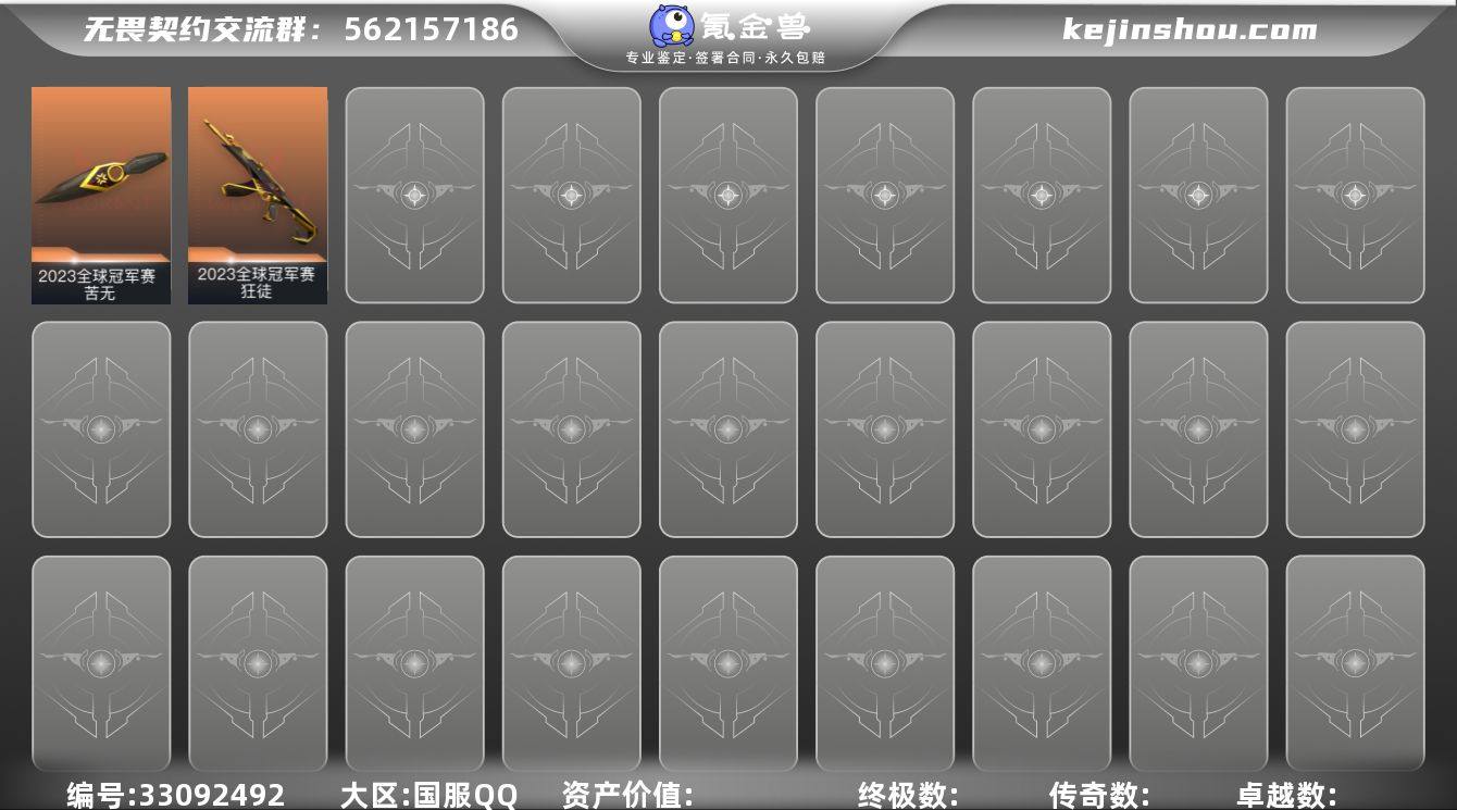 Q194389 【极品绝版23冠军套装 喜欢收藏的直接入】(2023全球冠军赛套装)无畏契约/等级15/段位未定级/英雄8/皮肤9/资产5670/已使用R点65/剩余R点75/2023全球冠军赛-狂徒,2023全球冠军赛-苦无