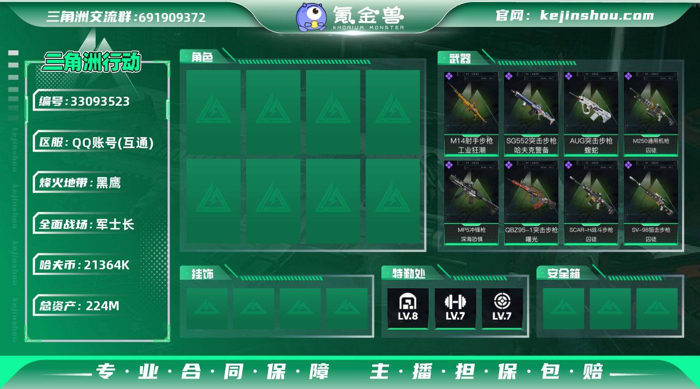 编号100155 不可二次等级60 总资产224.3m 流动资183.5m 哈夫币21364k 1刀皮 s8顶级安全箱 仓库lv8 训练中心lv7 靶场lv7 近战武器-处刑者