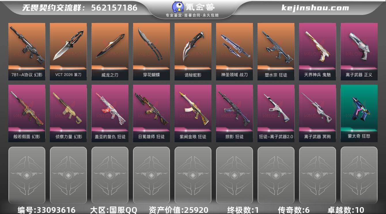 段位: 钻石 近战武器皮肤: 威龙之刃-耀鳞威龙,穿花蝴蝶-黑市,神圣领域 战刀,诡秘蛇影,VCT 2026 篆刀 步枪皮肤: 狂徒-紫阙金琅,狂徒-盖亚的复仇,幻影-侦察力量,狂徒-塑水宗,幻影-781-A协议,幻影-般若假面,狂徒-日冕雄师,狂徒-掠影,狂徒-离子武器2.0 佩枪皮肤: 鬼魅-天界神兵,正义-离子武器,蒙太奇 狂怒 狙击枪皮肤: 冥驹-离子武器 亮点: 【优质装备】:狂徒-塑水宗,幻影-781-A协议,狂徒-掠影,狂徒-紫阙金琅,狂徒-盖亚的复仇,幻影-侦察力量,幻影-般若假面,正义-离子武器,冥驹-离子武器,狂徒-日冕雄师,鬼魅-天界神兵,威龙之刃,穿花蝴蝶,神圣领域 战刀,诡秘蛇影