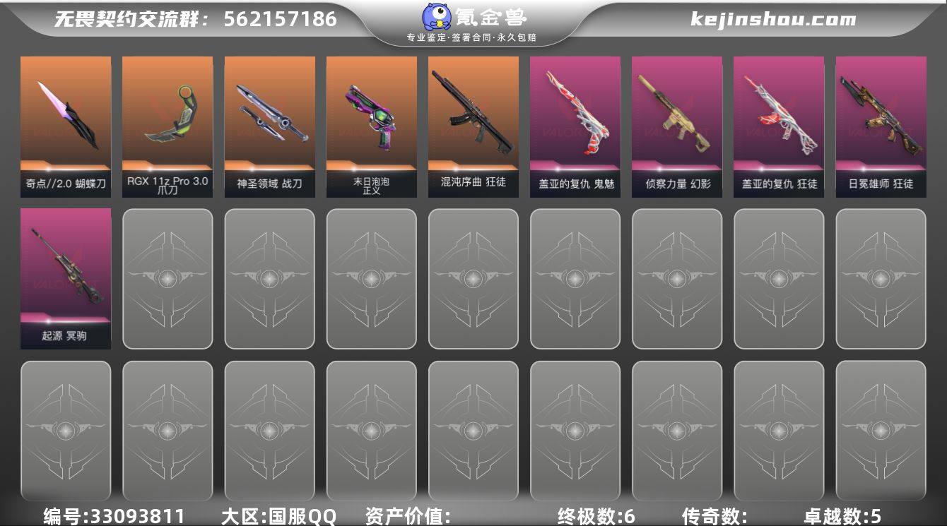 【qyz9818】可二次 玩够可回血 3刀小号绝对够用 qyz9818 【近战武器】:近战武器-穿花蝴蝶,近战武器-奇点//2.0 蝴蝶刀,近战武器-RGX 11z Pro//3.0 爪刀,近战武器-神圣领域 战刀 【狂徒】:狂徒-混沌序曲,狂徒-盖亚的复仇,狂徒-日冕雄师,狂徒-诡秘蛇影 【幻影】:幻影-侦察力量,幻影-神圣领域,幻影-末日之翼 【戍卫】:戍卫-月球哨兵,戍卫-折光棱晶 【獠犬】:獠犬-神圣领域 【冥驹】:冥驹-起源,冥驹-星云暗涌 【飞将】:飞将-末日之翼 【莽侠】:莽侠-诡秘蛇影,莽侠-月球哨兵 【战神】:战神-神圣领域 【奥丁】:奥丁-末日之翼 【判官】:判官-诡秘蛇影 【雄鹿】:雄鹿-月球哨兵 【骇灵】:骇灵-星云暗涌 【蜂刺】:蜂刺-星云暗涌,蜂刺-折光棱晶 【标配】:标配-折光棱晶 【正义】:正义-末日泡泡,正义-月球哨兵 【鬼魅】:鬼魅-盖亚的复仇,鬼魅-星云暗涌 【狂怒】:狂怒-神圣领域 【短炮】:短炮-末日之翼 【卡面】:无畏契约:尚勃勒 卡面,无畏契约GO!第一卷:芮娜 卡面,无畏契约GO!第一卷:零 卡面,《双城之战》金克丝 卡面,代号红色 卡面,新兵报到 卡面,V契约 卡面,无畏契约 卡面 【喷漆】:致命优雅 喷漆,买装还是存钱 喷漆,胜利属于无畏契...