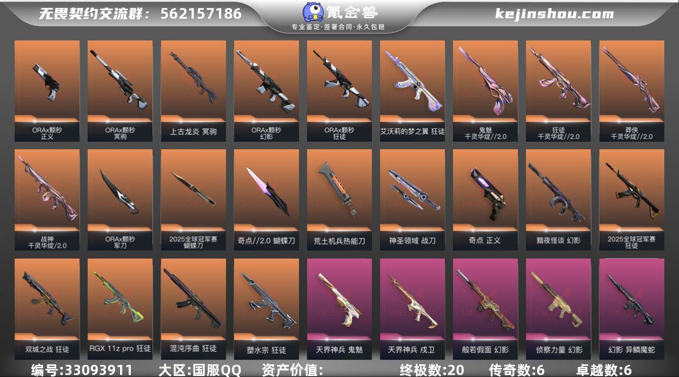 【qyz9827】【可二次】【玩够能回血】【5w2库存】 qyz9827 【近战武器】:近战武器-2025全球冠军赛 蝴蝶刀,近战武器-碎心裂刃,近战武器-流风回雪,近战武器-ORA x 颗秒 军刀,近战武器-奇点//2.0 蝴蝶刀,近战武器-紫金爪刀,近战武器-荒土机兵 热能刀,近战武器-神圣领域 战刀 【狂徒】:狂徒-2025全球冠军赛,狂徒-混沌序曲,狂徒-双城之战,狂徒-塑水宗,狂徒-RGX 11z Pro,狂徒-ORA x 颗秒,狂徒-千灵华绽//2.0,狂徒-艾沃莉的梦之翼,狂徒-盖亚的复仇,狂徒-荒土机兵 【幻影】:幻影-黯夜怪谈,幻影-ORA x 颗秒,幻影-般若假面,幻影-侦察力量,幻影-异鳞魔蛇,幻影-神圣领域,幻影-纳米打击 【戍卫】:戍卫-天界神兵,戍卫-逆冲蛮牛,戍卫-月球哨兵 【獠犬】:獠犬-神圣领域,獠犬-逆冲蛮牛 【冥驹】:冥驹-ORA x 颗秒,冥驹-上古龙炎,冥驹-荒土机兵,冥驹-星云暗涌 【莽侠】:莽侠-千灵华绽//2.0,莽侠-月球哨兵 【战神】:战神-千灵华绽//2.0,战神-神圣领域 【奥丁】:奥丁-纳米打击 【判官】:判官-纳米打击x 【雄鹿】:雄鹿-逆冲蛮牛,雄鹿-月球哨兵 【骇灵】:骇灵-荒土机兵,骇灵-无限竞技,骇灵-星云暗涌 【蜂刺】:蜂刺-星云暗涌 【标配】:标配-荒土机兵...
