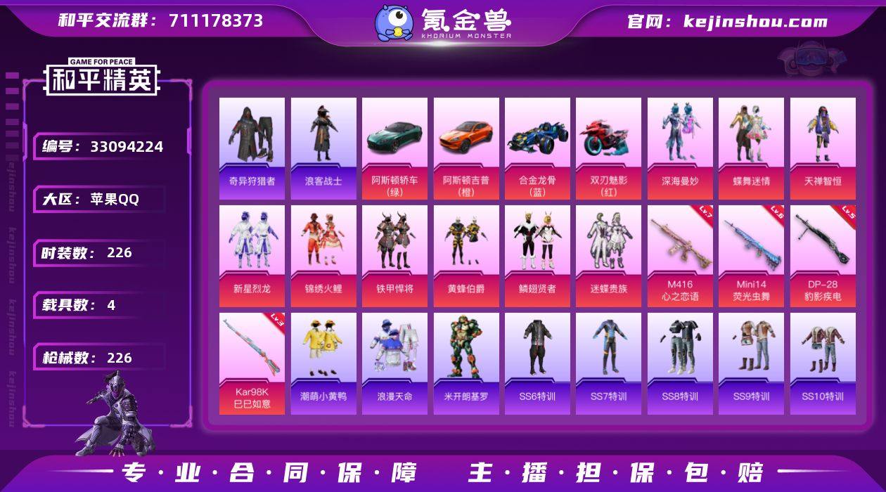 苹果 手Q-9粉装-4特效枪-4载具-6粉色飞行器-84679热力值-12王牌印记-226套装-226枪皮【热门品类】:套装-浪漫天命,套装-奇异狩猎者,套装-浪客战士,套装-SS1特训,旭日初心兜帽大衣,套装-潮萌小黄鸭【粉色套装】:粉装-深海曼妙,粉装-蝶舞迷情,粉装-天禅智恒,粉装-新星烈龙,粉装-锦绣火鲤,粉装-铁甲悍将,粉装-黄蜂伯爵,粉装-鳞翅贤者,粉装-迷蝶贵族【粉色枪皮等级】:M416-心之恋语(七级),Kar98K-巳巳如意(三级),Mini14-荧光虫舞(六级),DP-28-豹影疾电(五级)【粉色载具】:阿斯顿马丁DBS(绿),阿斯顿马丁DBX(橙),合金龙骨(蓝),双人摩托-双刃魅影(红)【粉色枪皮】:M416-心之恋语,Kar98K-巳巳如意,Mini14-荧光虫舞,DP-28-豹影疾电【粉色飞行器】:炫彩糖果飞行器,花间之火飞行器,潮汐统领飞行器,锦绣火鲤飞行器,荧光虫舞飞行器,魔法神域飞行器【粉色降落伞】:快乐主宰降落伞,百万伏特降落伞,春暖花开降落伞,神秘黑猫降落伞,古堡领主降落伞,四圣焕新降落伞,花间之火降落伞,潮汐统领降落伞,锦绣火鲤降落伞,荧光虫舞降落伞,音爆索尼克降落伞,仲夏莫吉托降落伞,精灵梦叶罗丽降落伞,喜羊羊与灰太狼降落伞,异瞳寒姬降落伞【稀有套装...
