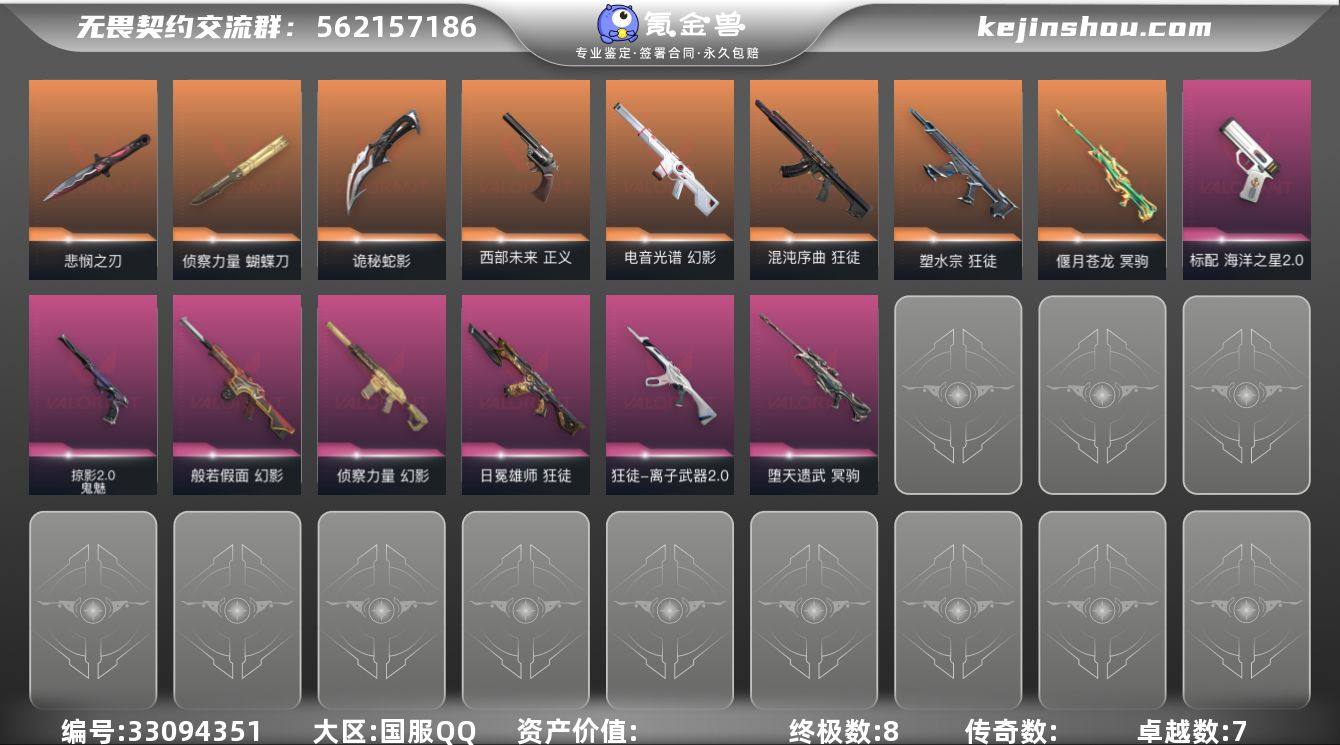 【套装】:无畏契约季前邀请赛套装【英雄】:幻棱,炼狱,维斯,暮蝶,钛狐,壹决,铁臂,捷风,雷兹,幽影,不死鸟,贤者,猎枭,蝰蛇,零,芮娜,奇乐,尚勃勒,霓虹,斯凯,夜露,星礈,K/O,海神,盖可,黑梦,钢锁【近战武器】:近战武器-无畏契约季前邀请赛 悲悯之刃,近战武器-侦察力量 蝴蝶刀,近战武器-诡秘蛇影 军刀【狂徒】:狂徒-混沌序曲,狂徒-塑水宗,狂徒-日冕雄师,狂徒-离子武器//2.0,狂徒-诡秘蛇影【幻影】:幻影-电音光谱,幻影-般若假面,幻影-侦察力量,幻影-末日之翼,幻影-电音光谱【戍卫】:戍卫-折光棱晶【冥驹】:冥驹-偃月苍龙,冥驹-堕天遗武【飞将】:飞将-末日之翼【莽侠】:莽侠-诡秘蛇影【奥丁】:奥丁-末日之翼【判官】:判官-诡秘蛇影【骇灵】:骇灵-无限竞技【蜂刺】:蜂刺-折光棱晶【标配】:标配-海洋之星//2.0,标配-超能偶像,标配-折光棱晶【正义】:正义-西部未来,正义-超限闪存,正义-纳米打击【鬼魅】:鬼魅-掠影//2.0,鬼魅-诡秘蛇影,鬼魅-星云暗涌【短炮】:短炮-末日之翼【卡面】:终章:激斗汉堡 卡面,进入射程 卡面,《双城之战》拥抱 卡面,精灵大战 卡面,欢迎来到底城 卡面,南瓜盛典 卡面,修车达人 卡面,正义的化...